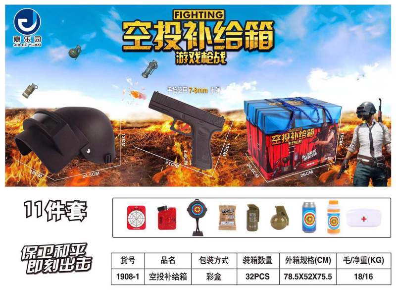 Parachute drop supply box, game gun war equipment, stimulating battlefield, defending peace and security, instant attack toy, helmet, pistol, gun target ring, oil pot, pan-bottom pot target ring, dry water bullet, bomb, whistle, first-aid box, pills, etc.