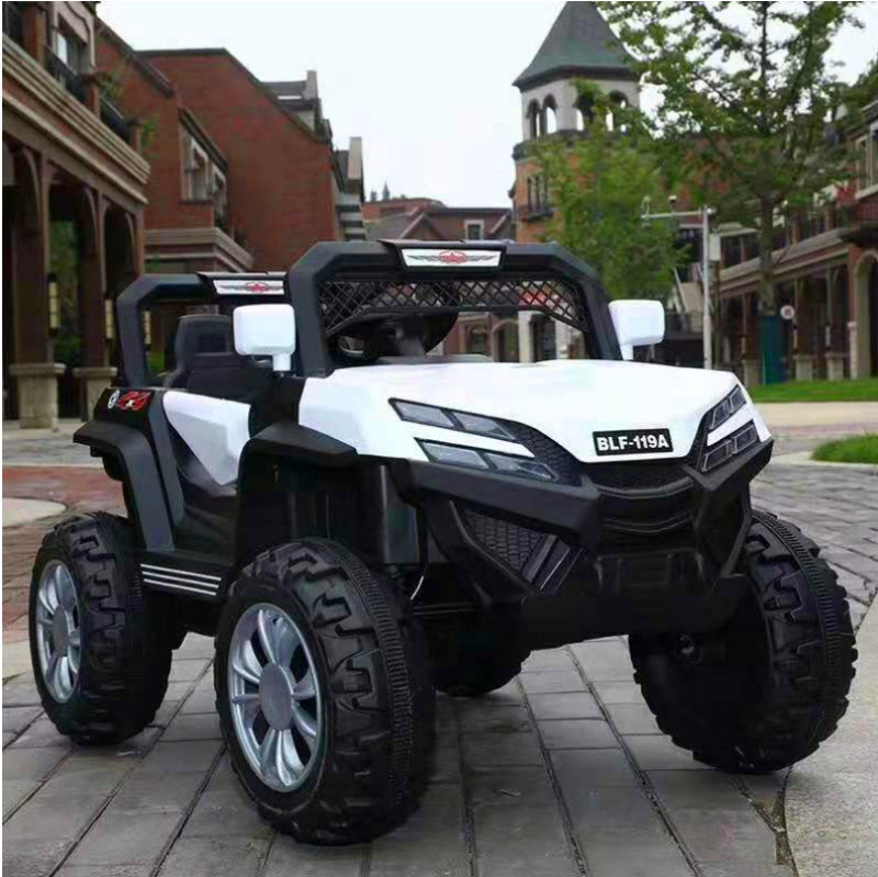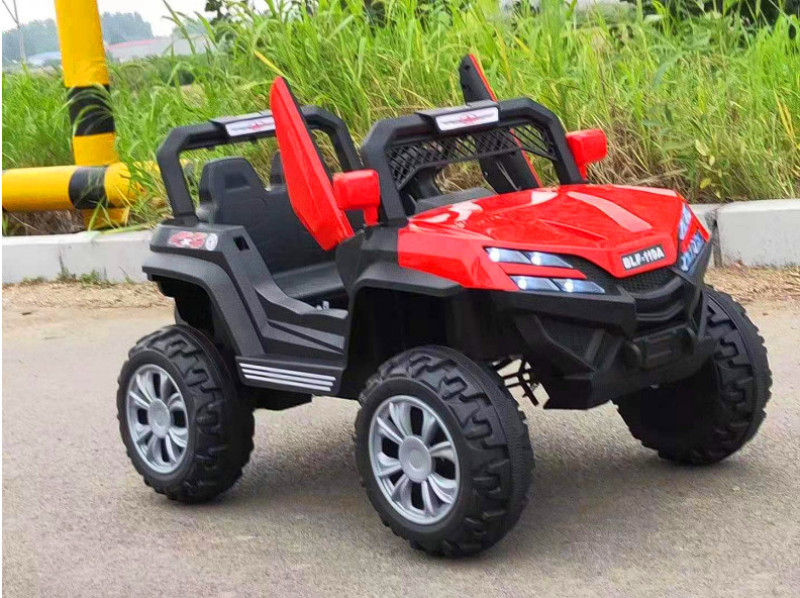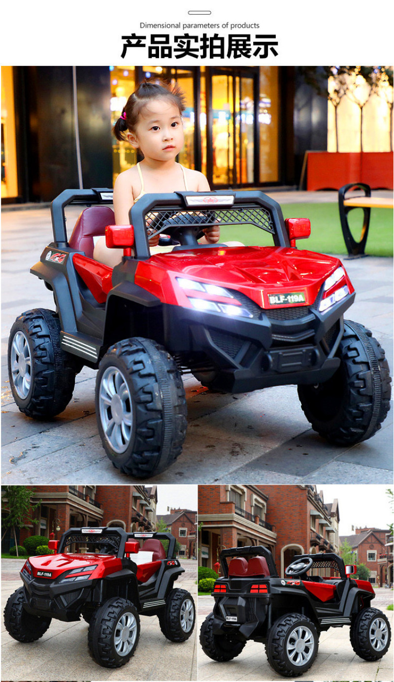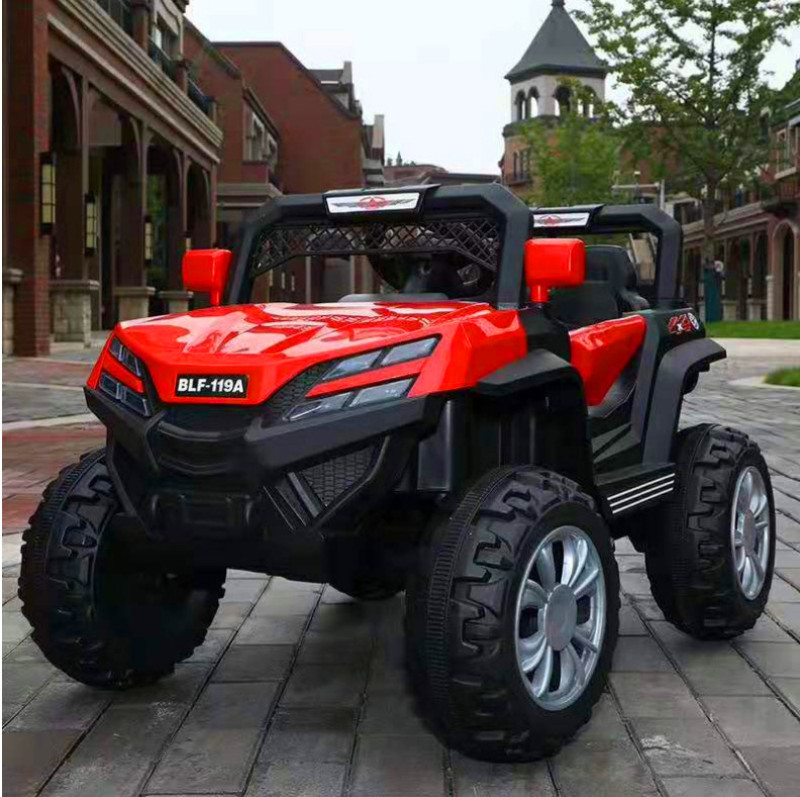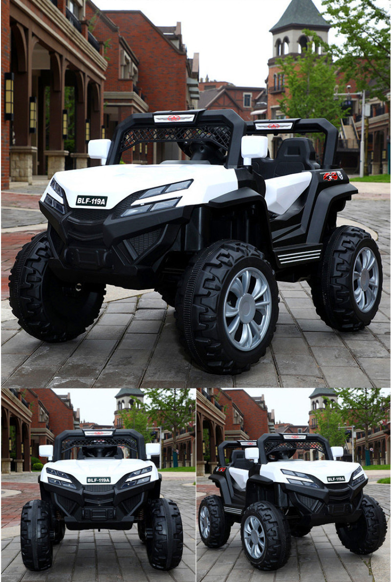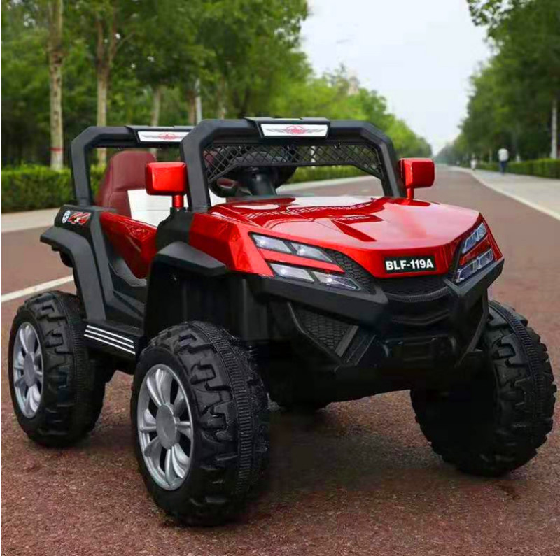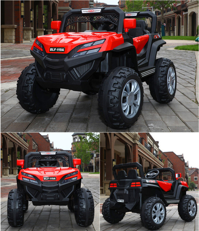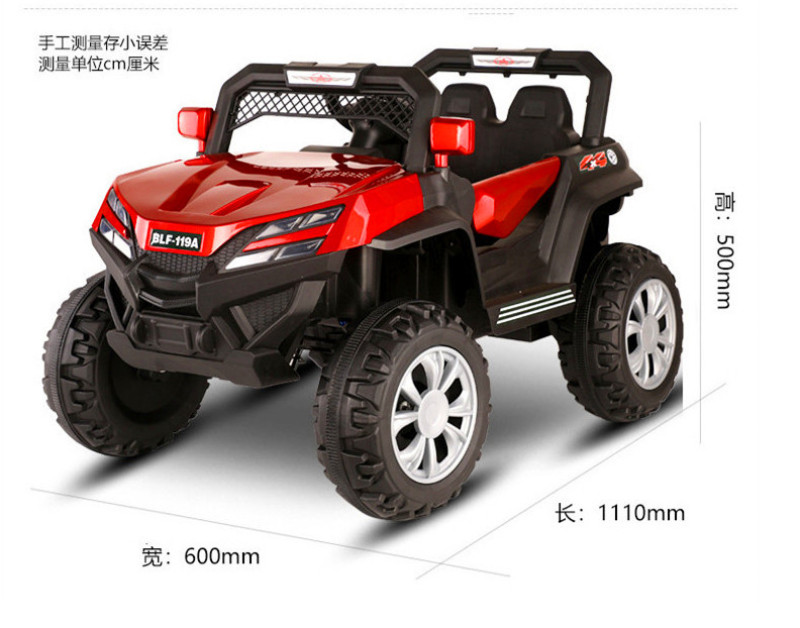 New model off-road vehicle with 12V super powerful motor. Available options include: - 12V dual-motor dual-battery system - Four-wheel drive motor with large battery (optional) - Double-high doors - One-button start-up - 2.4G one-to-one remote control - Battery level indicator - Quiet front and rear sway function - Early education function - English stories - LED headlights - USB and MP3 ports - Four-wheel shock absorbers - Convenient pull handles - App-controlled smartphone remote - Colors: White, red, blue, and painted-on-top-of-red-wine color Weight: Gross weight 16.8 kg, Net weight 12.8 kg Dimensions: Overall size 111 x 68 x 63 cm Packing dimensions: 103 x 69 x 39 cm