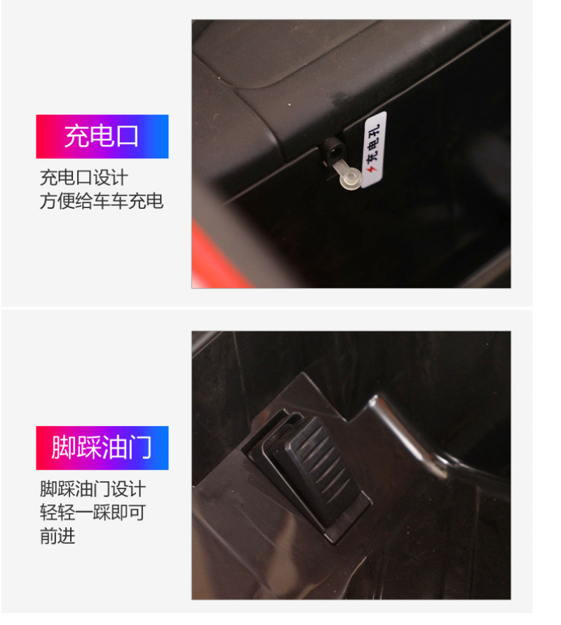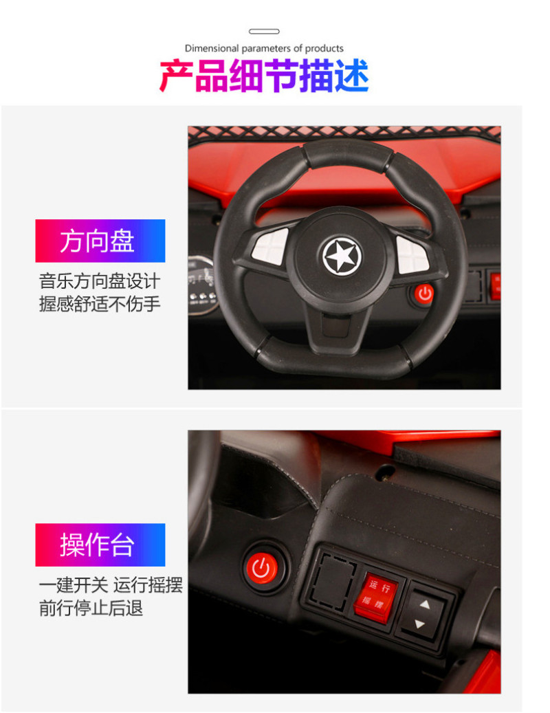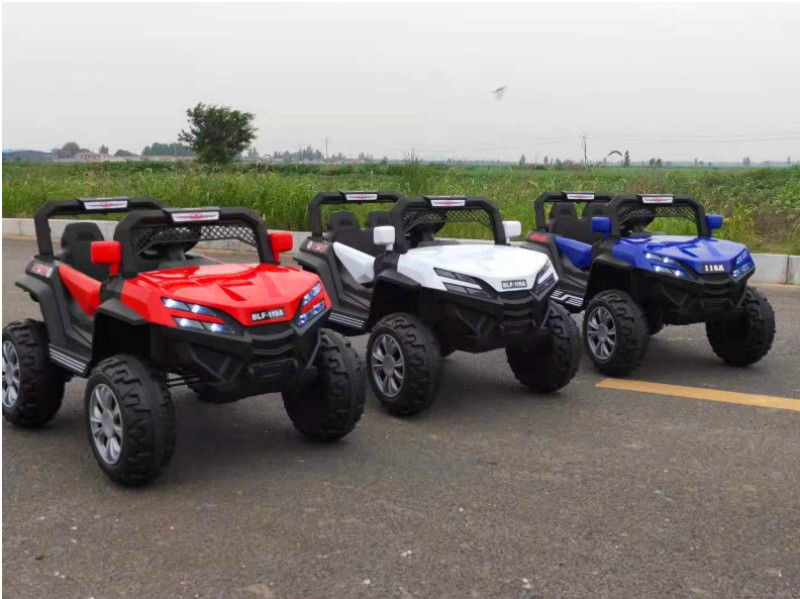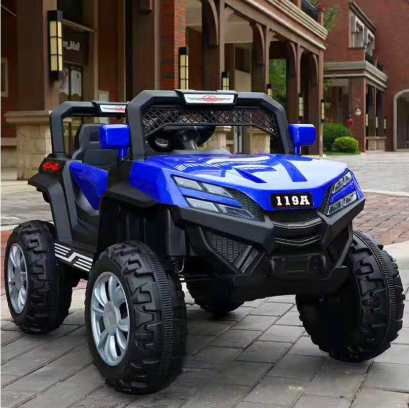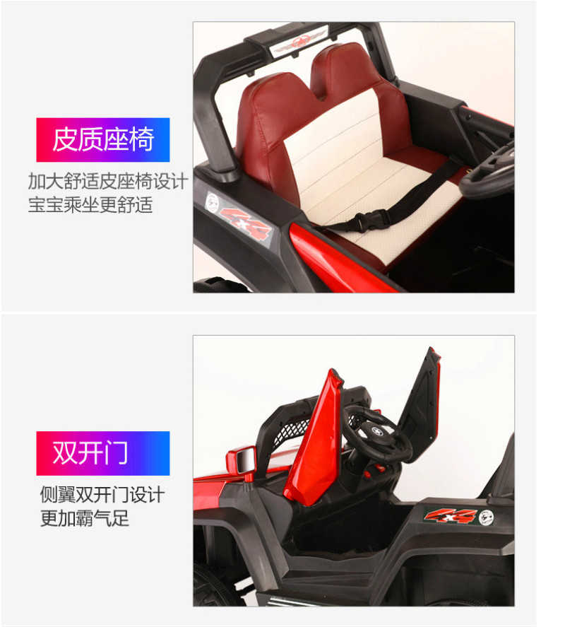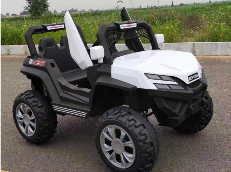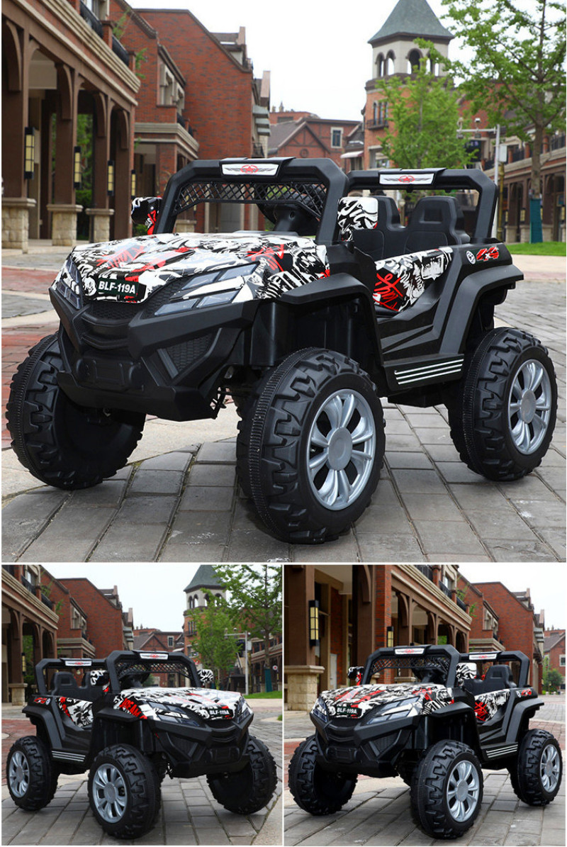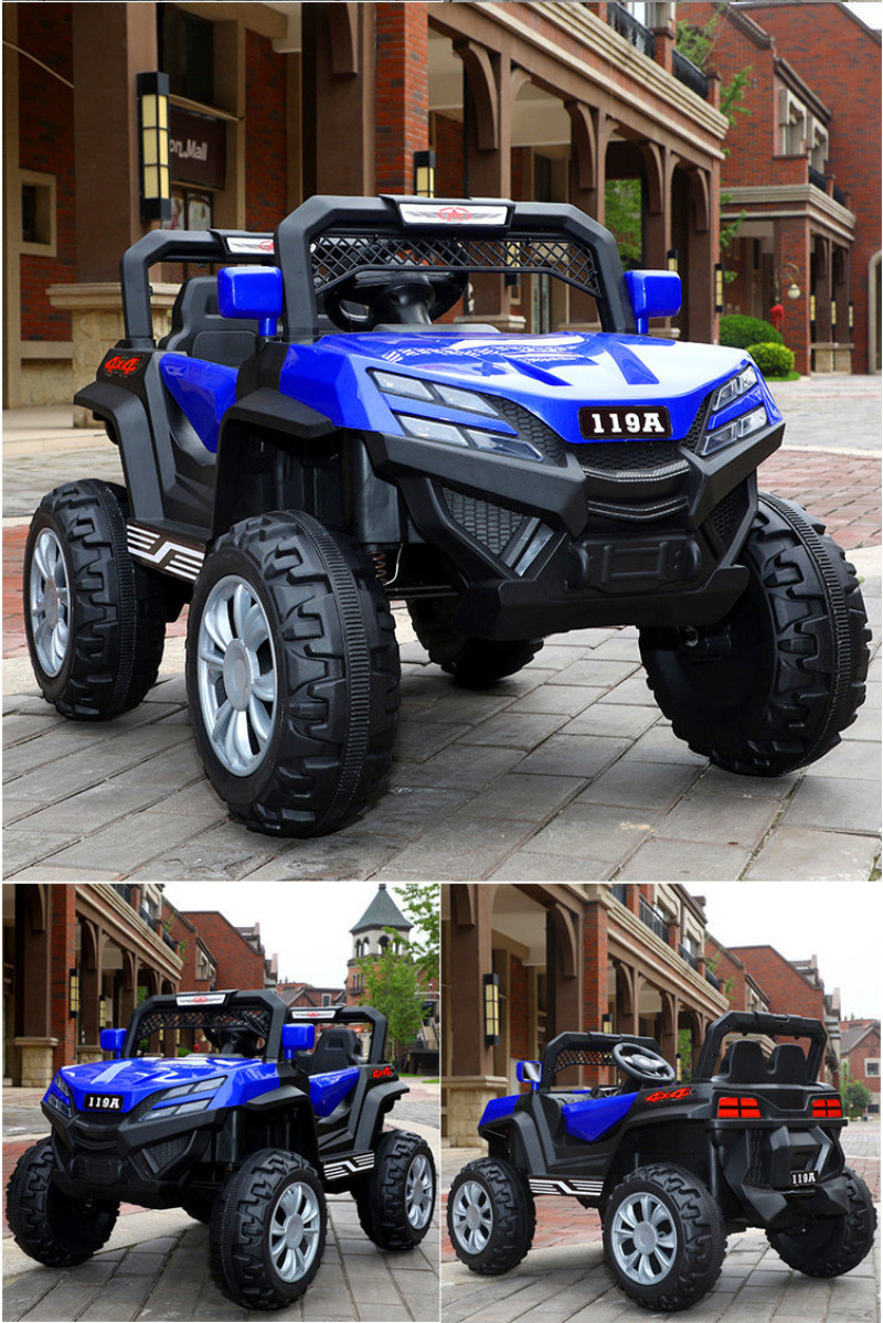 New model off-road vehicle with 12V super powerful motor. Available options include: - 12V dual-motor dual-battery system - Four-wheel drive motor with large battery (optional) - Double-high doors - One-button start-up - 2.4G one-to-one remote control - Battery level indicator - Quiet front and rear sway function - Early education function - English stories - LED headlights - USB and MP3 ports - Four-wheel shock absorbers - Convenient pull handles - App-controlled smartphone remote - Colors: White, red, blue, and painted-on-top-of-red-wine color Weight: Gross weight 16.8 kg, Net weight 12.8 kg Dimensions: Overall size 111 x 68 x 63 cm Packing dimensions: 103 x 69 x 39 cm
