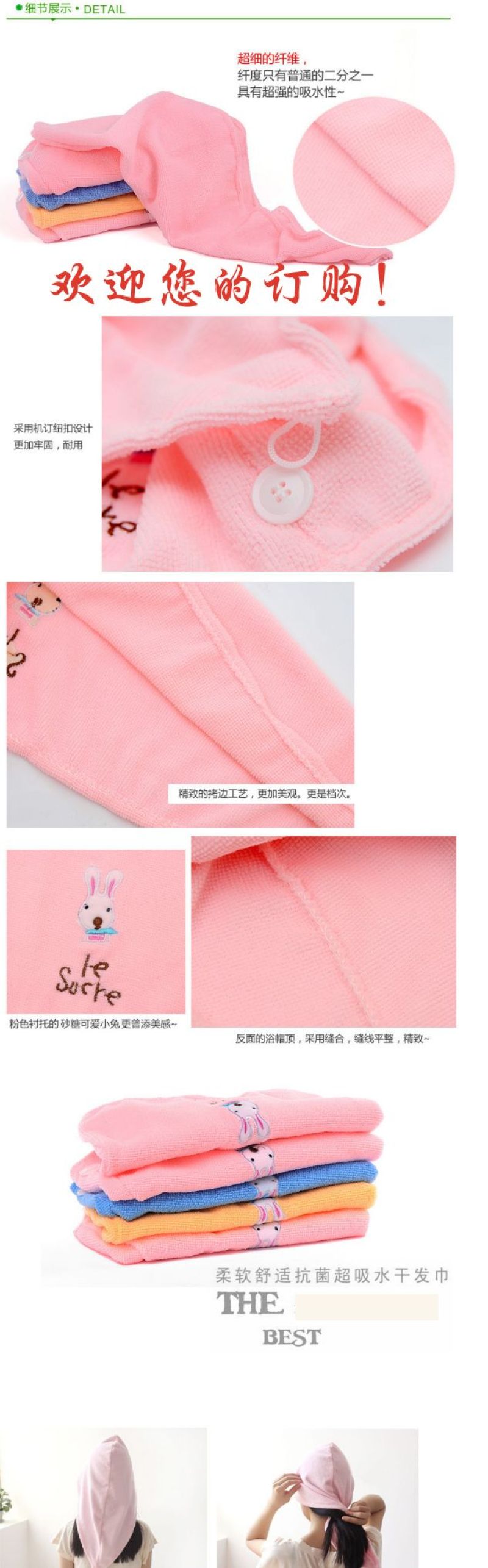 The reverse bath cap top is sewn with smooth stitching, delicate ~ soft and comfortable antibacterial super absorbent hair towel.