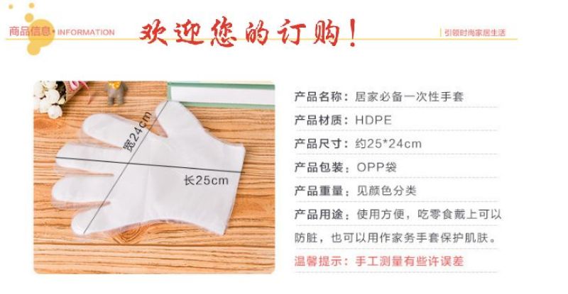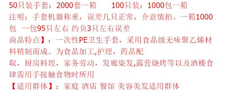Disposable PE sanitary gloves are made of food-grade unscented polyethylene. For food processing, nursing, medicine dispensing, kitchen preparation, housework, hair salon dyeing, camping and barbecue, as well as restaurants and restaurants where hand contact is required.