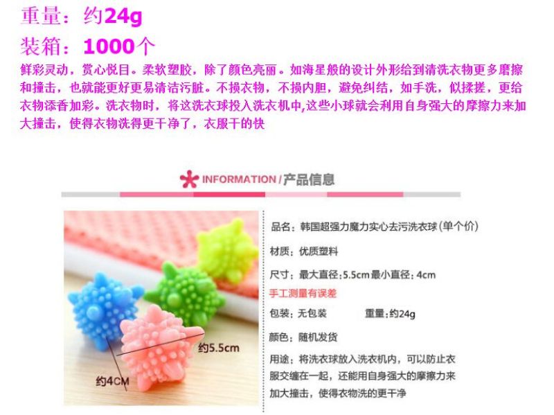 Vivid colors, pleasing to the eye. Soft plastic, except for bright color. The starfish shape gives laundry more friction and impact, which makes it easier to clean dirt. Do not damage clothing, do not damage the bladder, avoid entanglement, such as hand washing, like rubbing, more to add fragrance and color clothing.