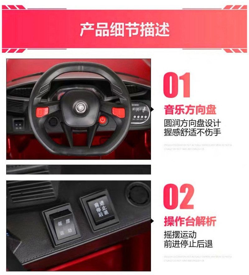 Bird King - Children's Electric Car. Configuration: Standard without sway, high-end, top-end with paint. Colors: Red, orange, white, paint navy blue, paint wine red. This product is mainly supplied to export companies and directly purchased by foreign merchants. Our factory is an enterprise with independent import and export rights. We can FOB Tianjin Port, accept US dollars, and OEM sample processing. Branding! Company brand trademarks: "Bird King", "Oulma".