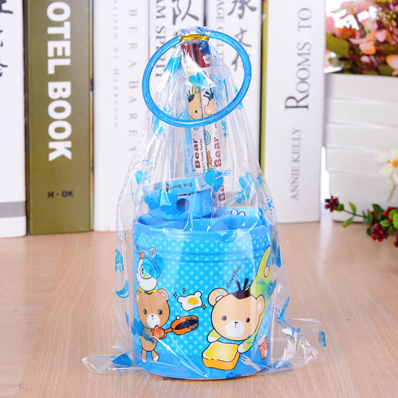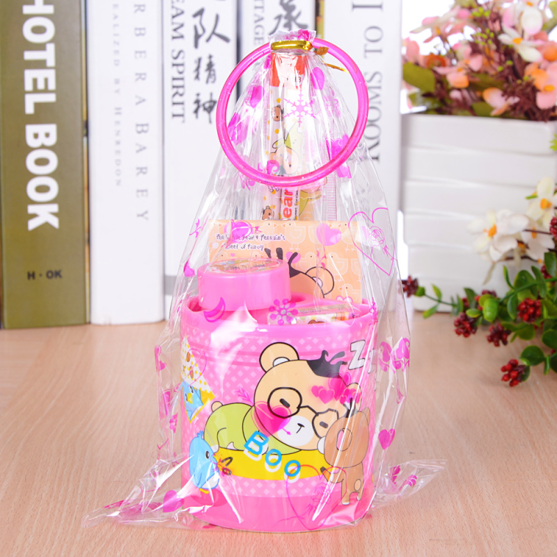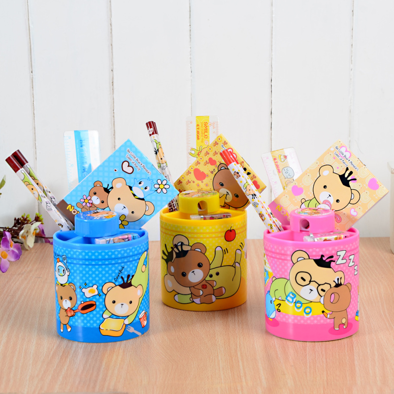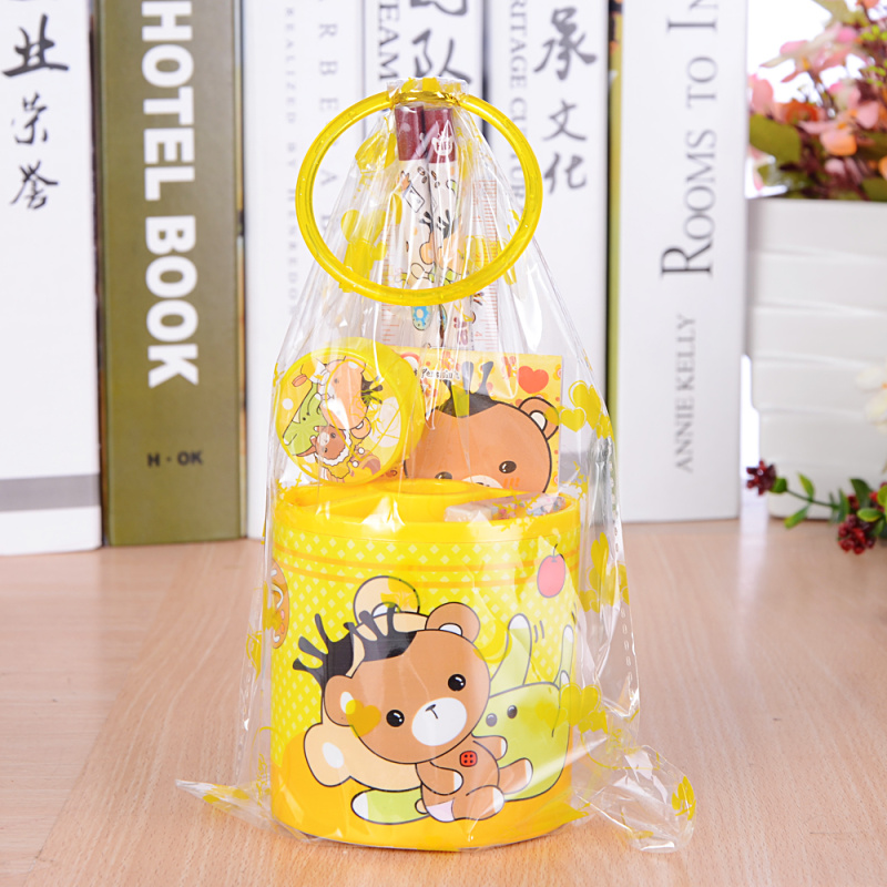 The cylinder stationery set includes: 1 15cm ruler, 2 pencils, 1 pencil sharpener, 1 eraser, and 1 notepad.