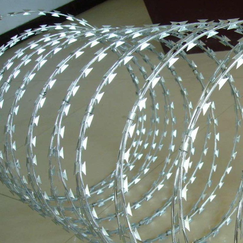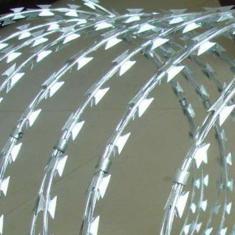 编制特点:刀片刺绳是由锐利尖角的钢丝,以及高张力钢丝做线芯组合成的阻绝材料。由于刺线网造型独特不易触摸,因而能达到极好的防护效果。