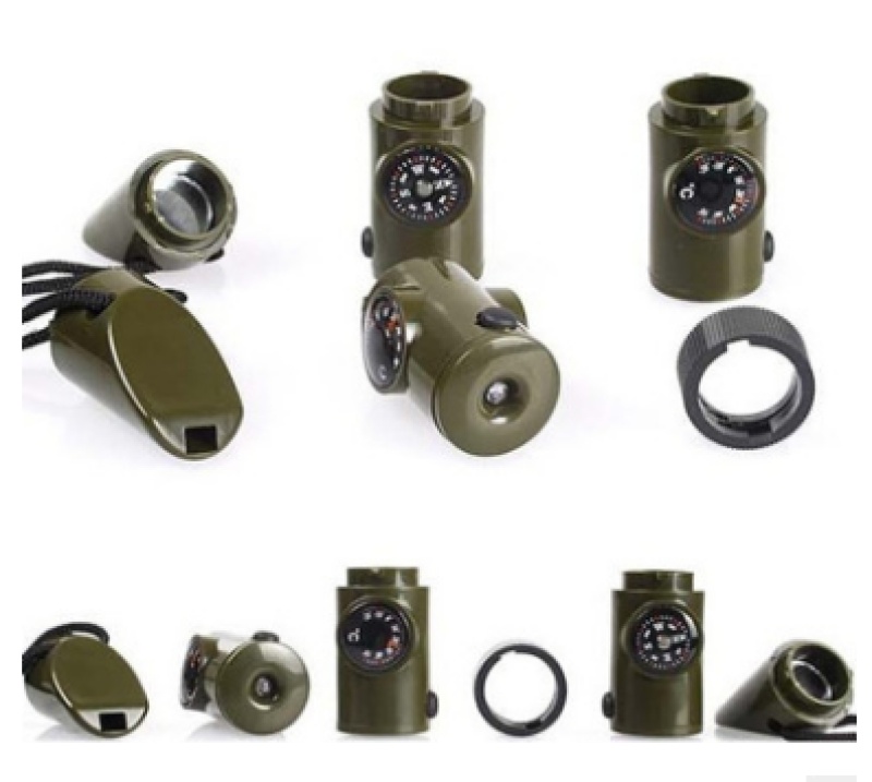 Features: the whistle is military green, light and practical, cylindrical design, especially suitable for wild use. Whistling in the wild not only whistle collection role, but also life-saving role! Multi-function together: whistle, compass, thermometer, magnifying glass, mirror, LED light, small storage bin. Original with a rope, hanging on the neck when outdoor activities very convenient! Camping adventure, travel and leisure essential supplies