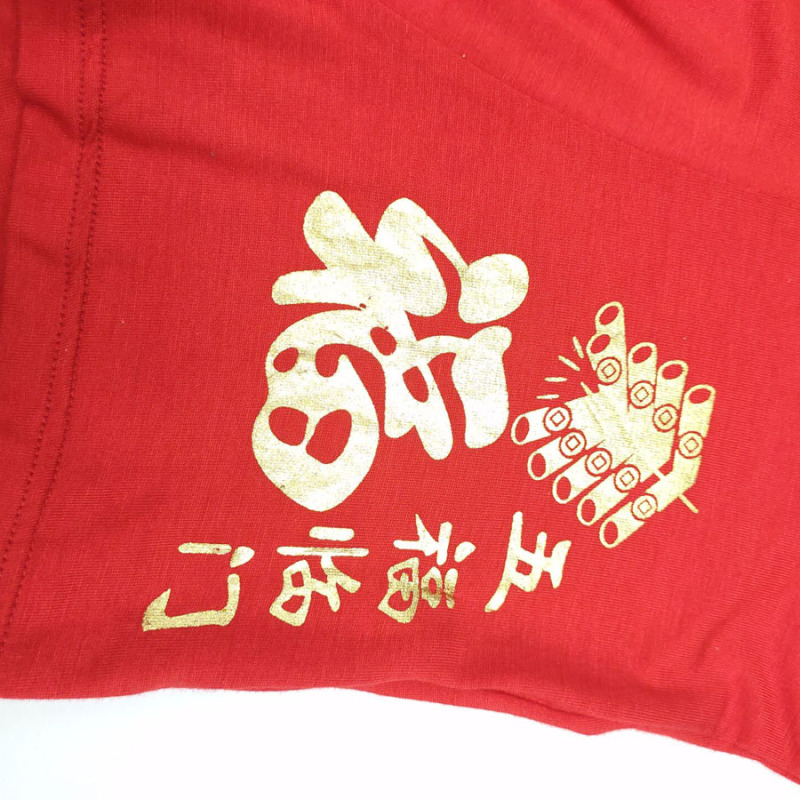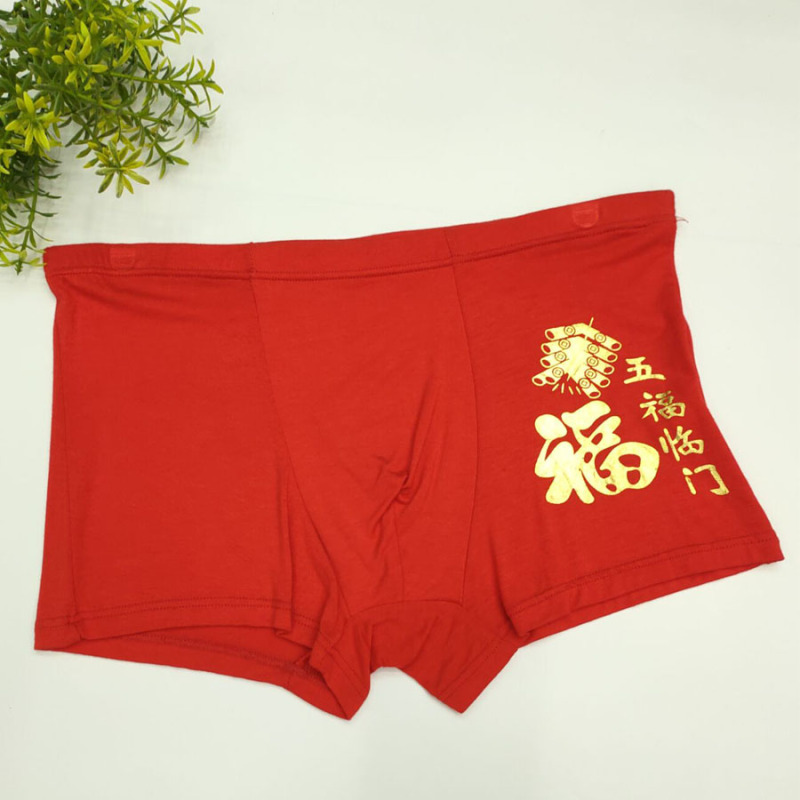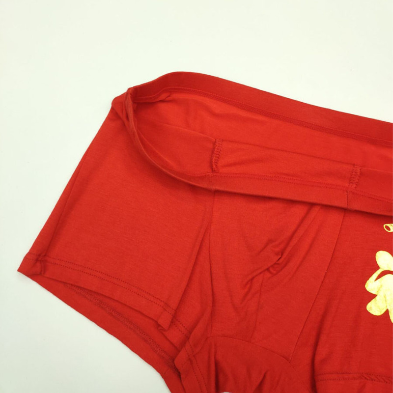 Men's red inner pants for the year of the Ox, with Modal trimmed edges, available in sizes 4XL and 5XL. Engraved with gold "Fú" character.