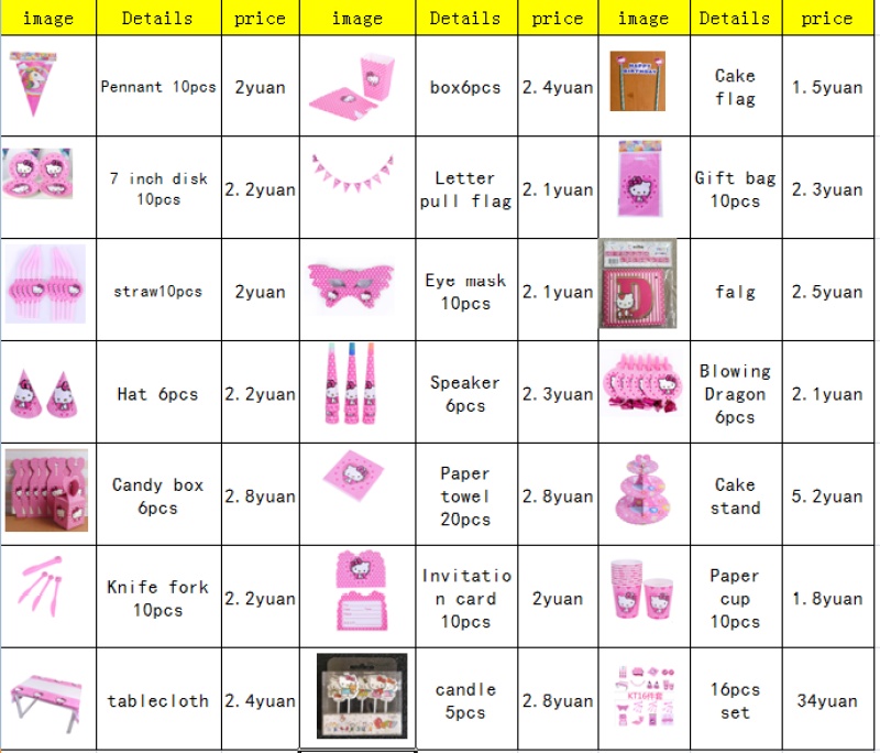 Includes: tablecloth 1 + hat 6 + cup 10 + plate 10 + napkin 20 + pennant 10 + knife 10