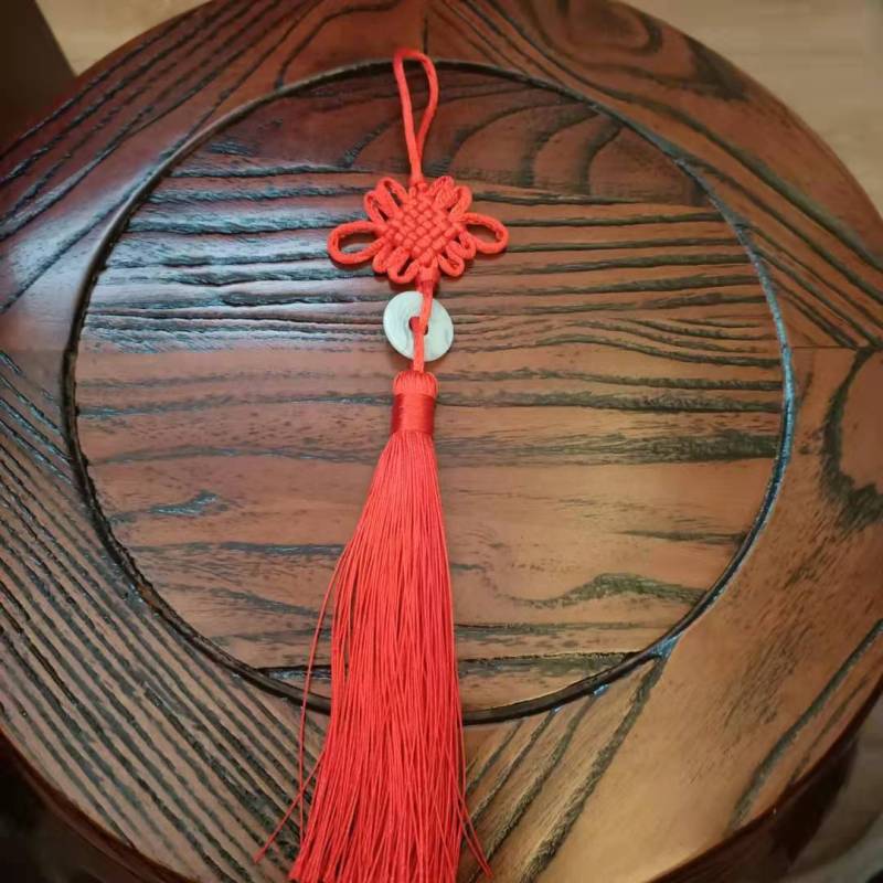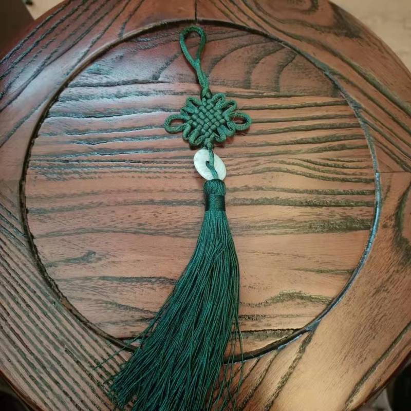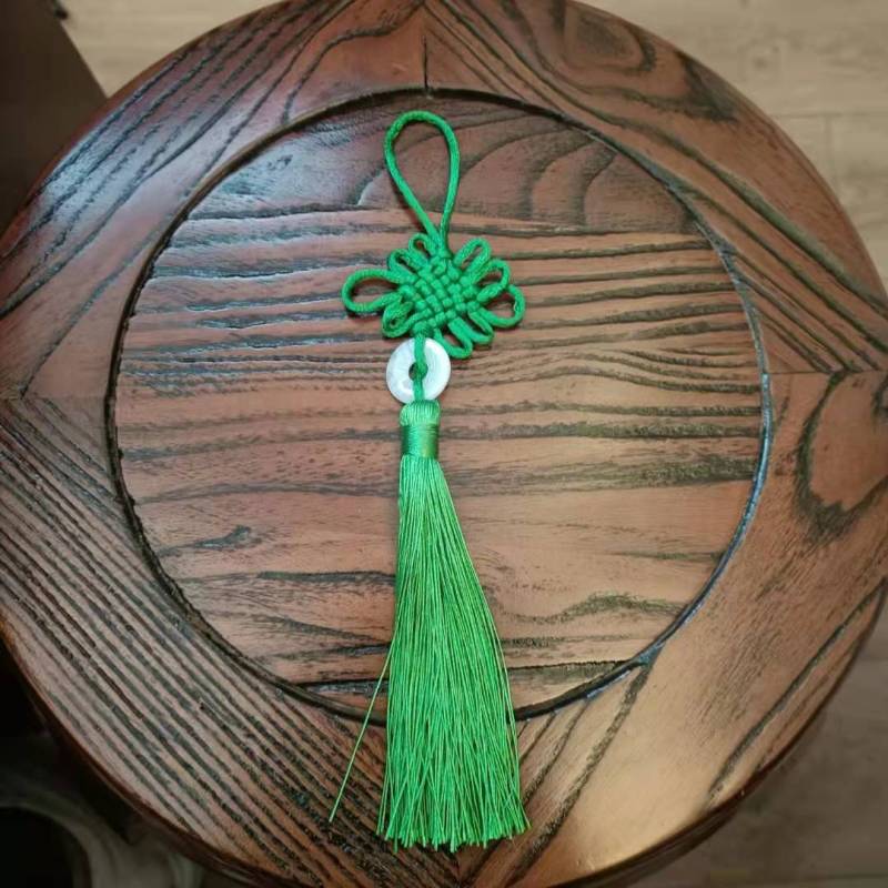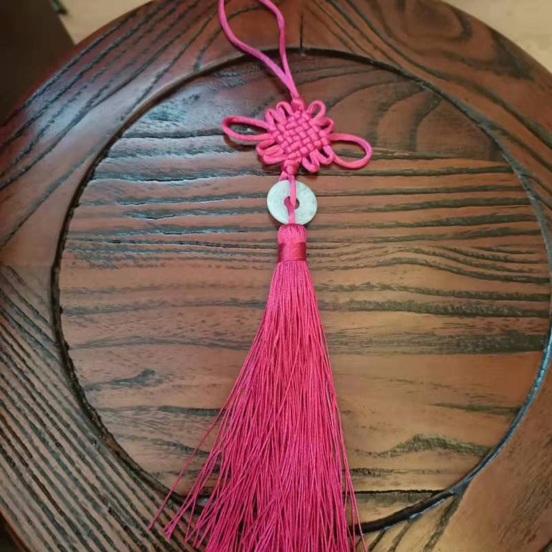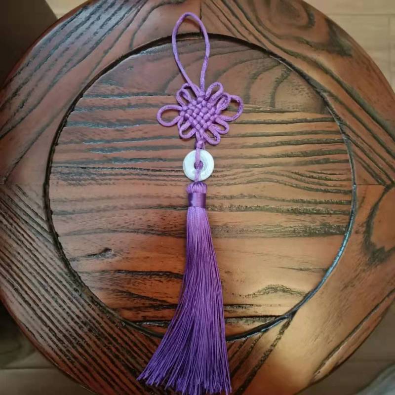 This Chinese knot is available in a variety of colors, with white jade pieces inlaid in the middle.