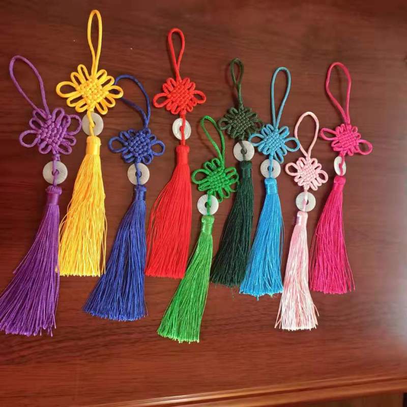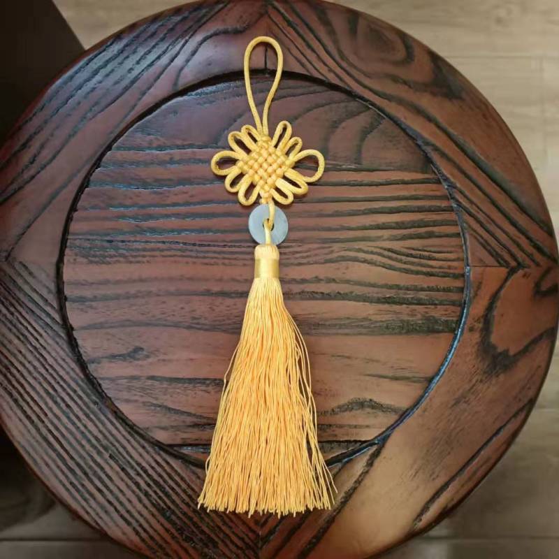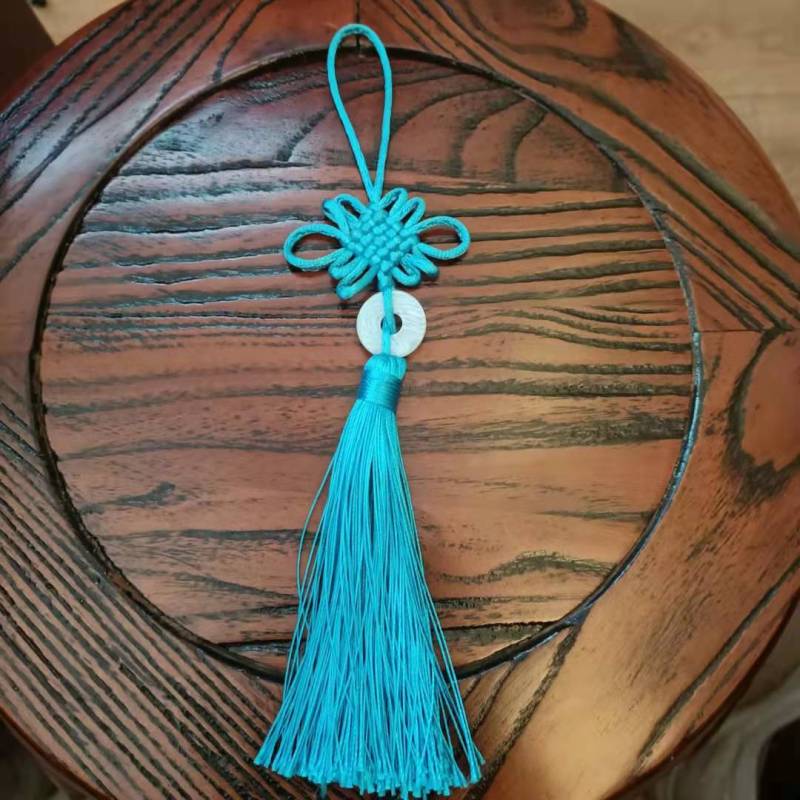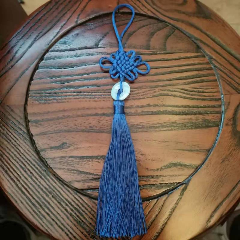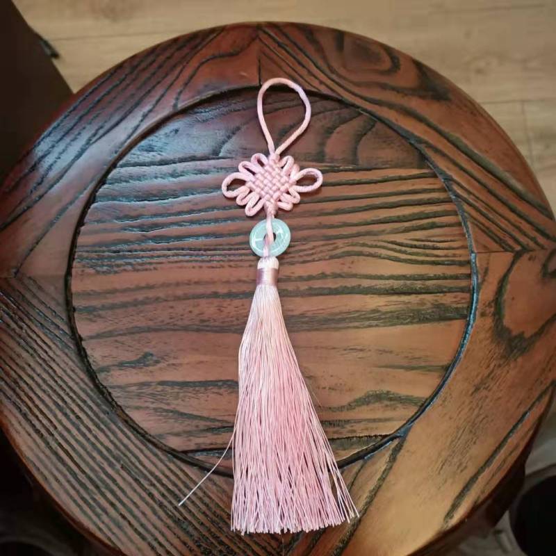 This Chinese knot is available in a variety of colors, with white jade pieces inlaid in the middle.