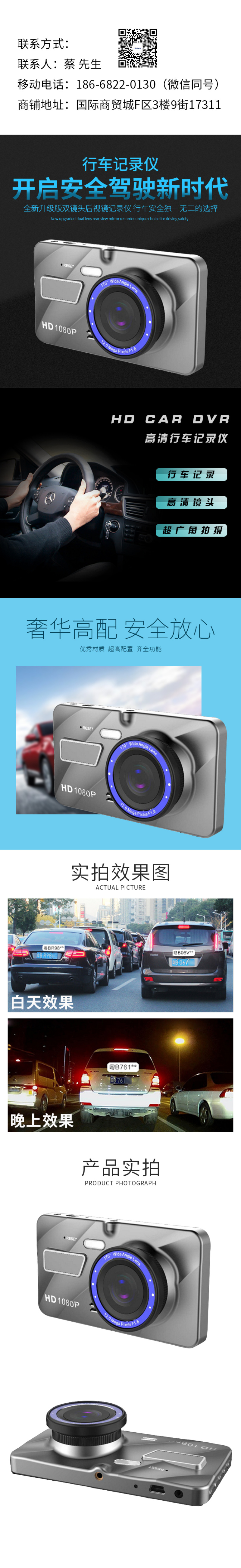 Dashcam hd dark night vision reversing video before and after double recording