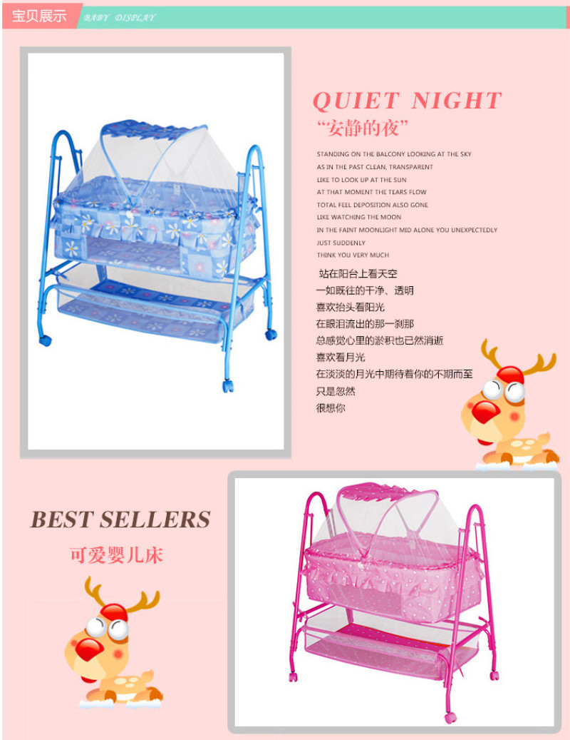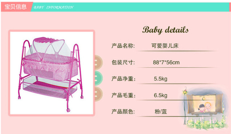 Bird King - Baby Cradle. Colors: Pink, Blue. This product is mainly supplied to export companies and directly purchased by foreign merchants. Our factory is an enterprise with the right to independently import and export. We can offer FOB Tianjin Port, accept US dollars, and provide OEM sample processing and branding services! Company brand trademarks: "Bird King", "Oralma".