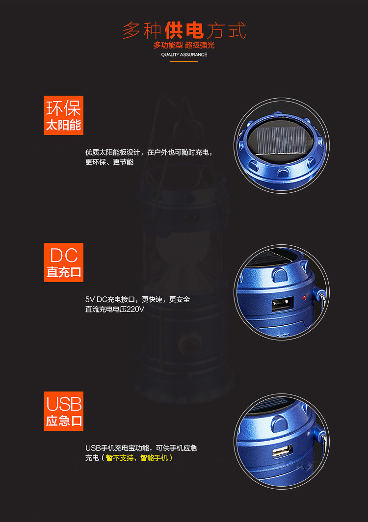 1. It has three power supply modes: solar charging, battery and direct charging, which can make outdoor camping bright all the time and outdoor work Unlimited, bringing you a happy trip first gear switch, convenient and practical, simple to use.