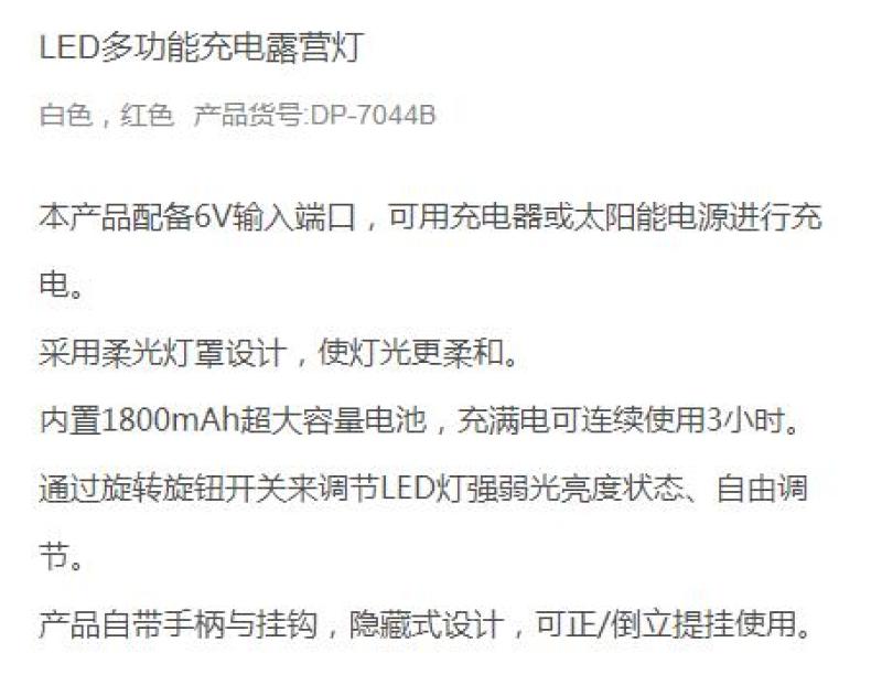 About Product:DP-7044B long - term rechargeable camping lamp