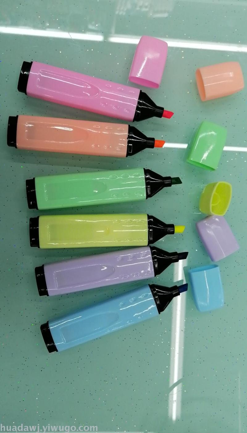 macaron color fluorescent pen adopts national first-class ink, adopts new material, black cover head color rod design, smooth writing, bright color, no fading and fading, Red Blue yellow green purple coral 6 colors, can be customization as request, you can use your mobile phone, QQ:378518316 WeChat 13750931650 or go to the store for an interview. Welcome customers!!
