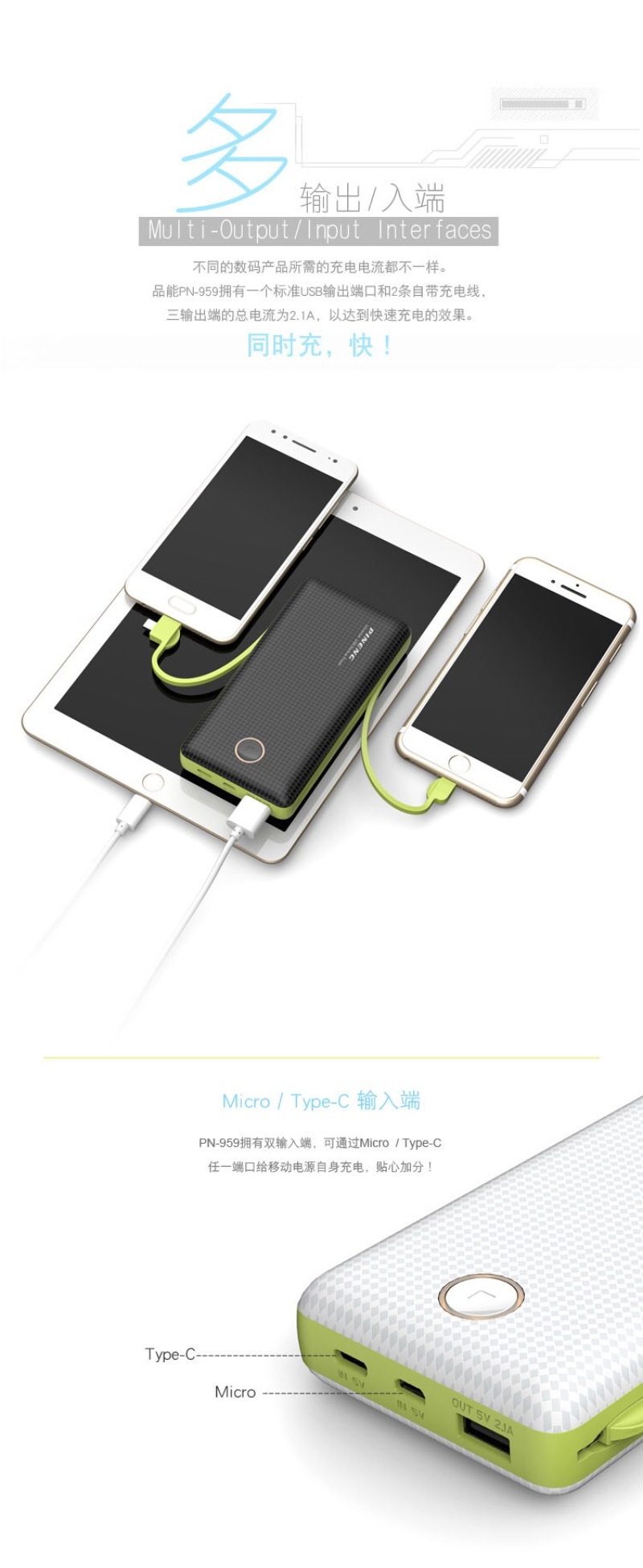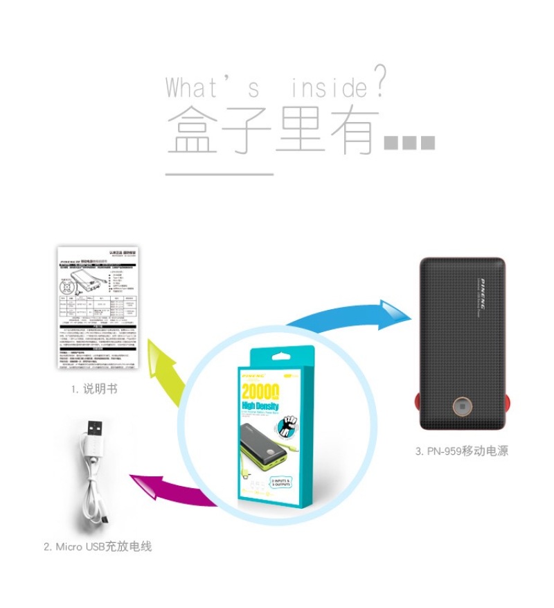 PN959 large capacity mobile power portable smart phone with universal cable charger 20000mAh