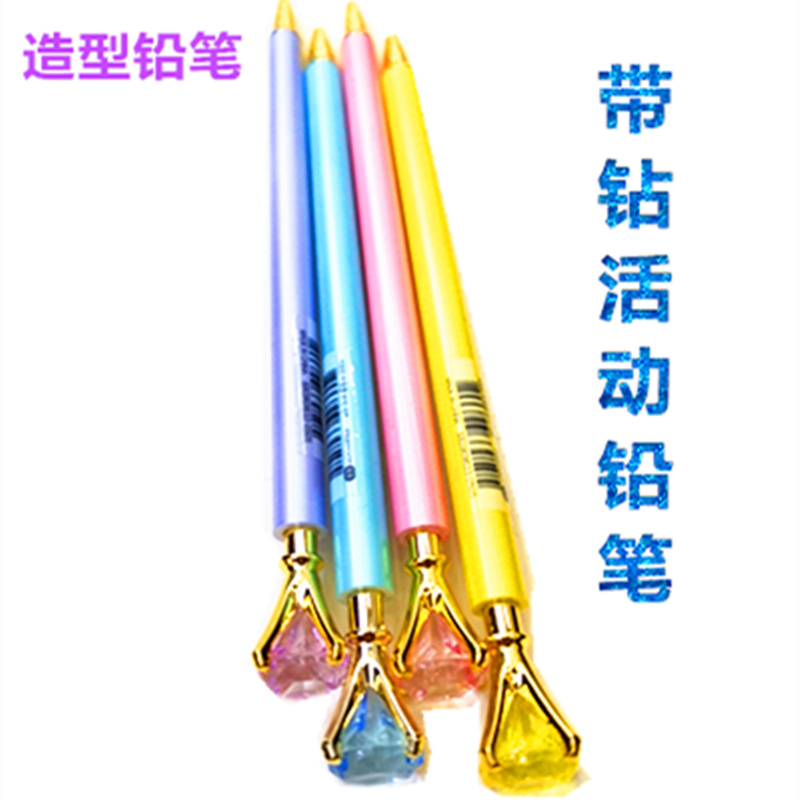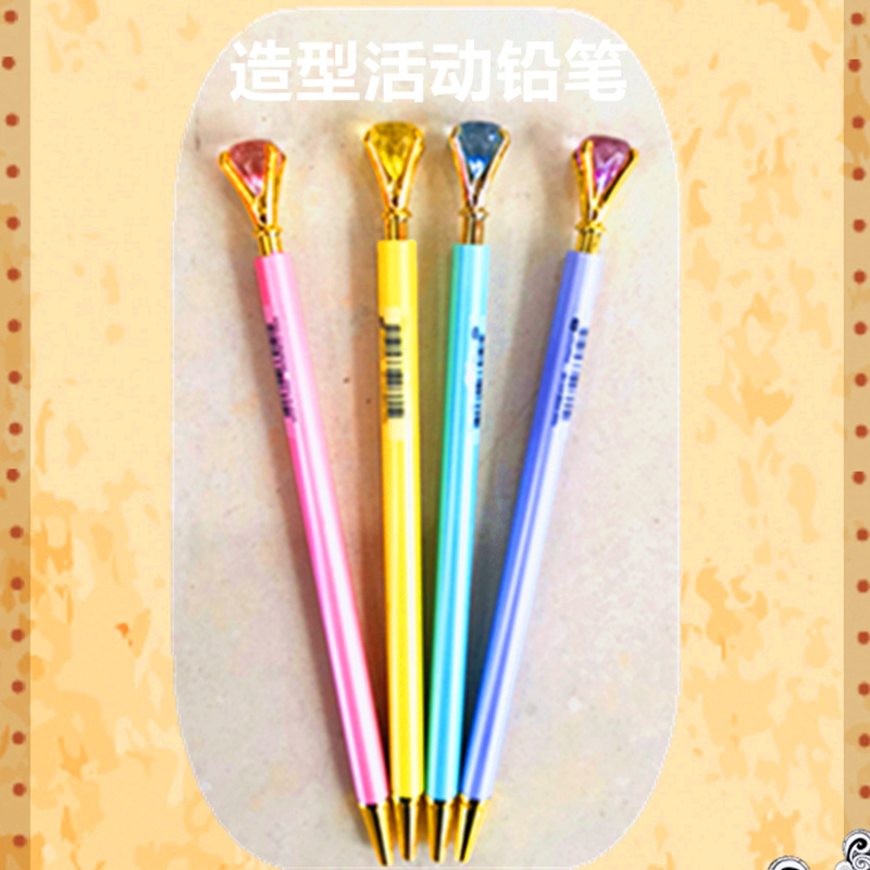 厂家直销创意钻石活动铅笔,水晶玻璃钻石铅笔,学生礼品广告笔。笔杆喷漆处理,颜色鲜艳,钻石部分有四个颜色,分别是粉红色浅紫色鹅黄色和湖兰色四个色组成,金属开花,质量好,美观大方!