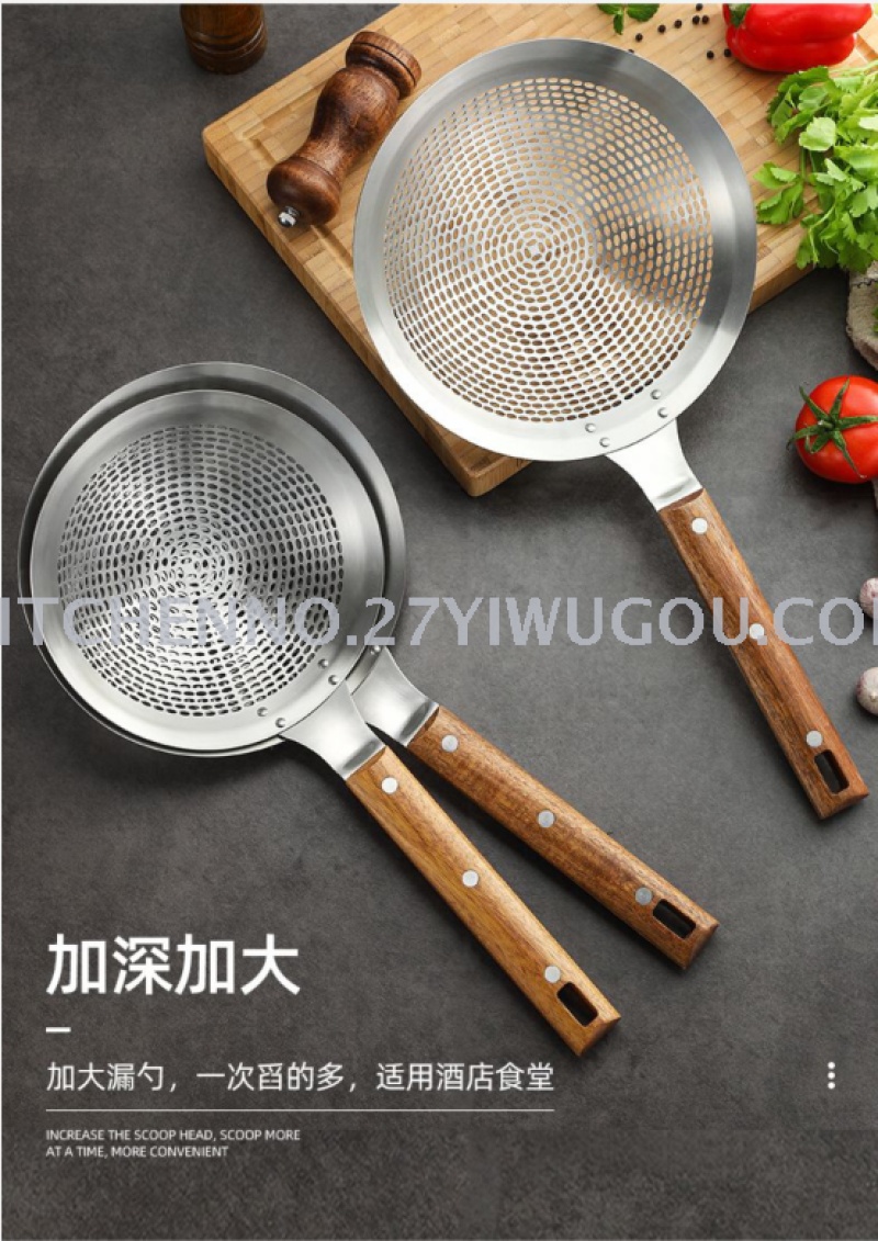 Short handle high-grade 304 wooden handle slotted spoon high-end hotel kitchen slotted spoon kitchen leakage