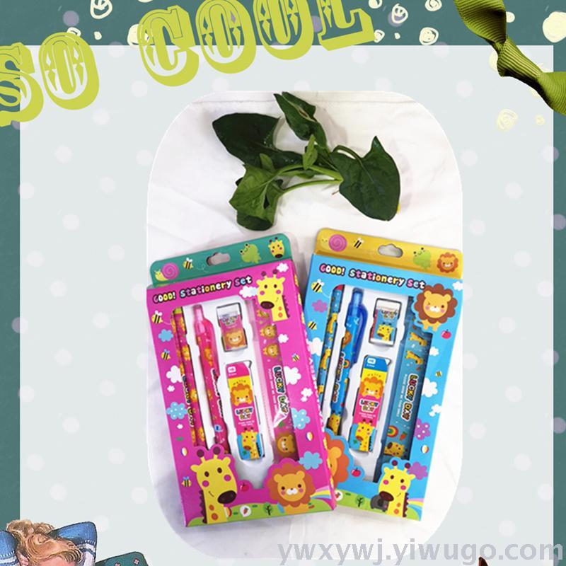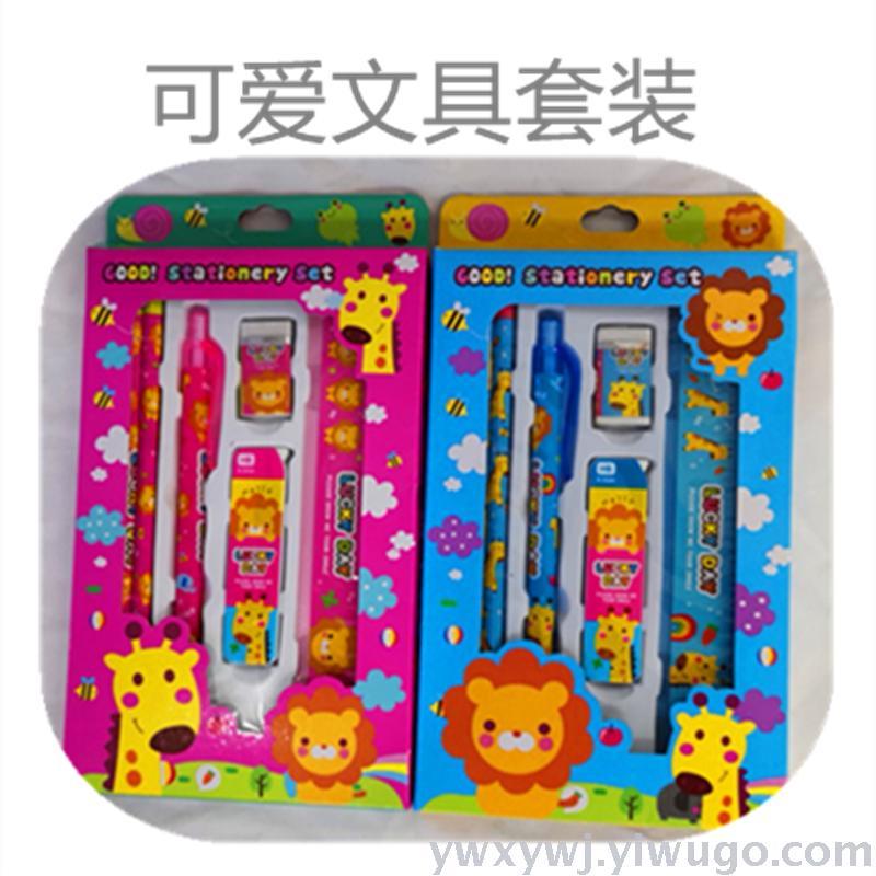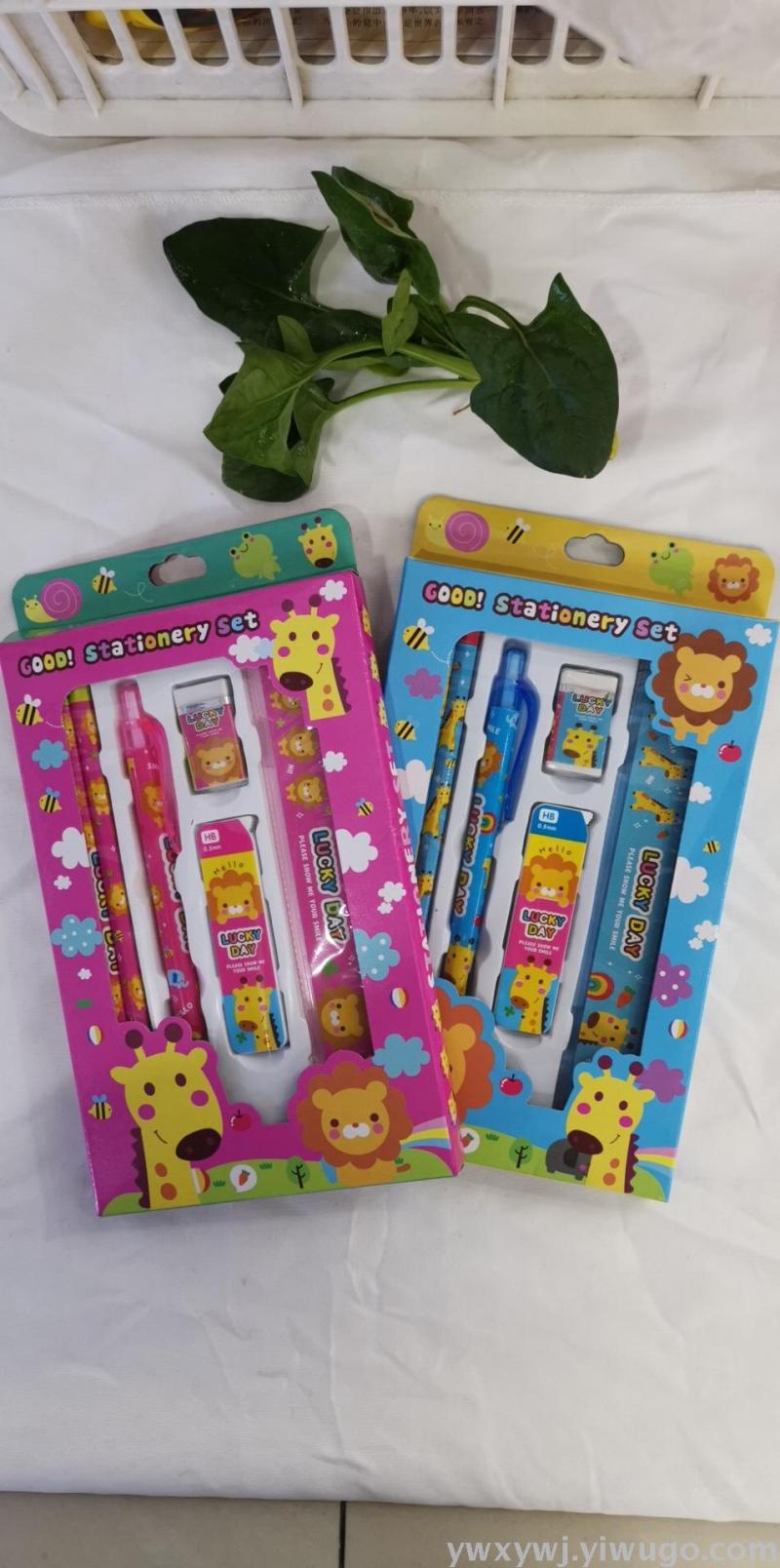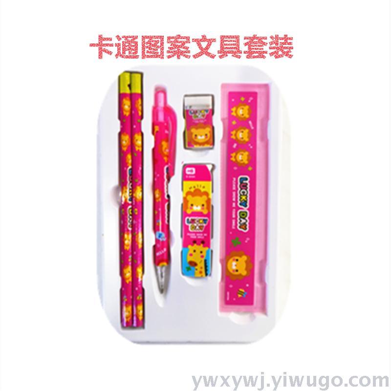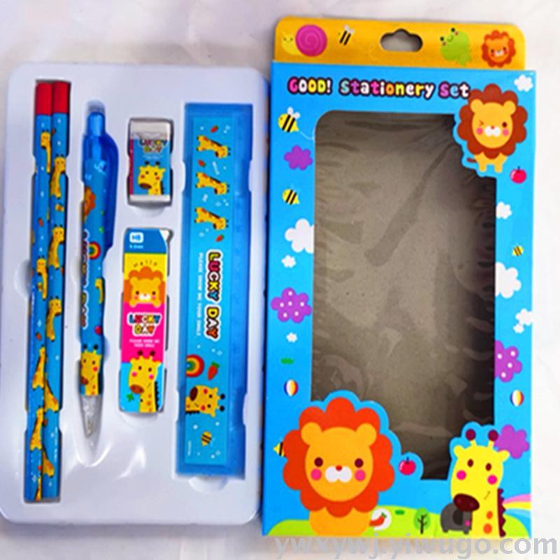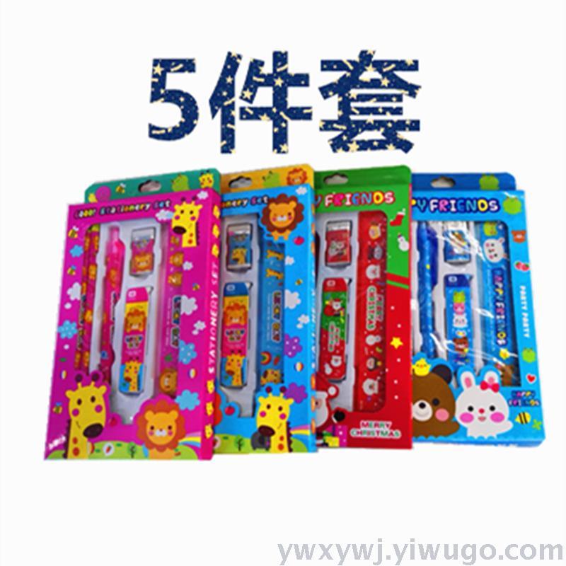 学生学习文具套装礼盒,儿童学习文具用品,生日礼物,厂家定制批发价销售。卡通儿童文具套装,由2支铅笔一支活动铅笔一合铅笔芯一块橡皮一把直尺,5种产品组成5件套,一箱装360套,整件起批,不包运费,具体拍下请和客服联系,谢谢!