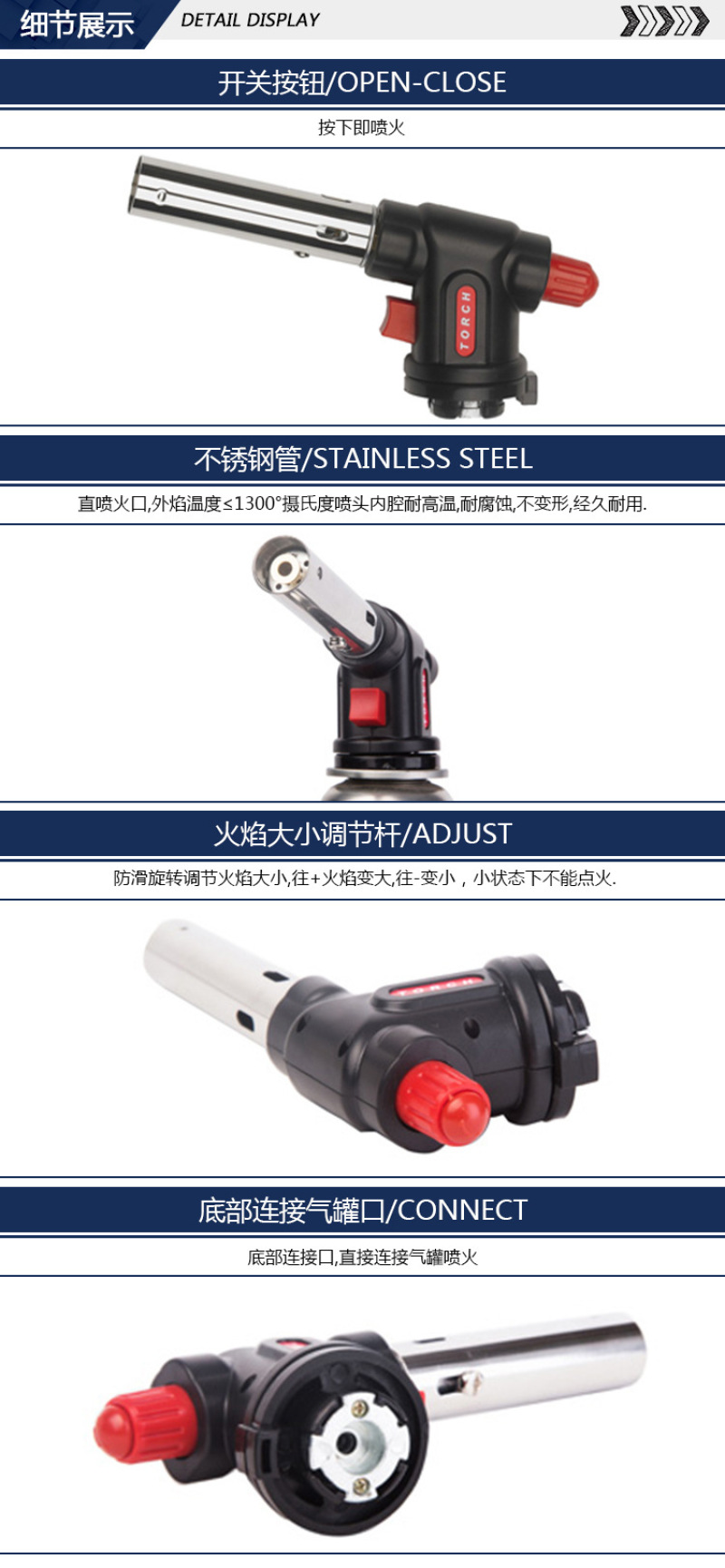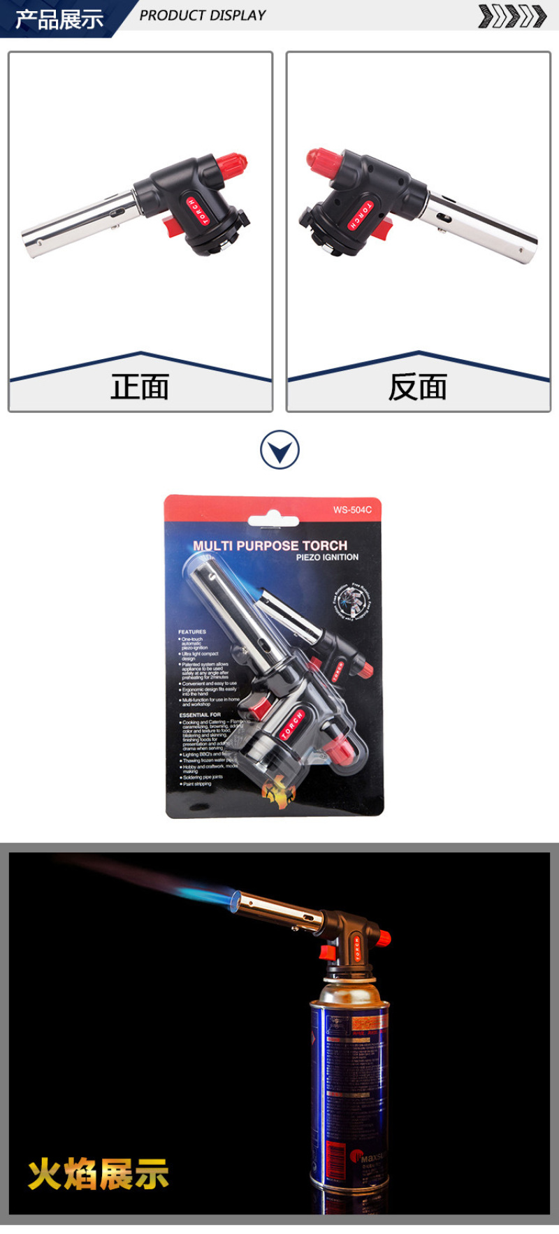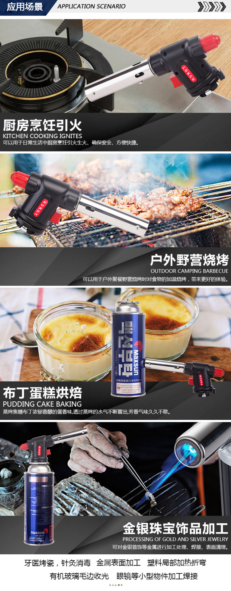 About Product:Cake surface fire/baking treatment ● fromage cake/mousse cake demoulding ● barbecue ● field boiling water/cooking/hot pot, etc. ● field fire extraction ● treatment Trotter, handle pig head, etc. ● Iron pipe/copper pipe/plastic pipe, etc. elbow ● metal surface cleaning ● cement/terrazzo surface treatment is natural stone surface ● welding ● cutting ● bamboo and wood crafts processing and production ● Pipeline thawing ● engine winter quick heating before start ● building waterproof construction ● drying, heating