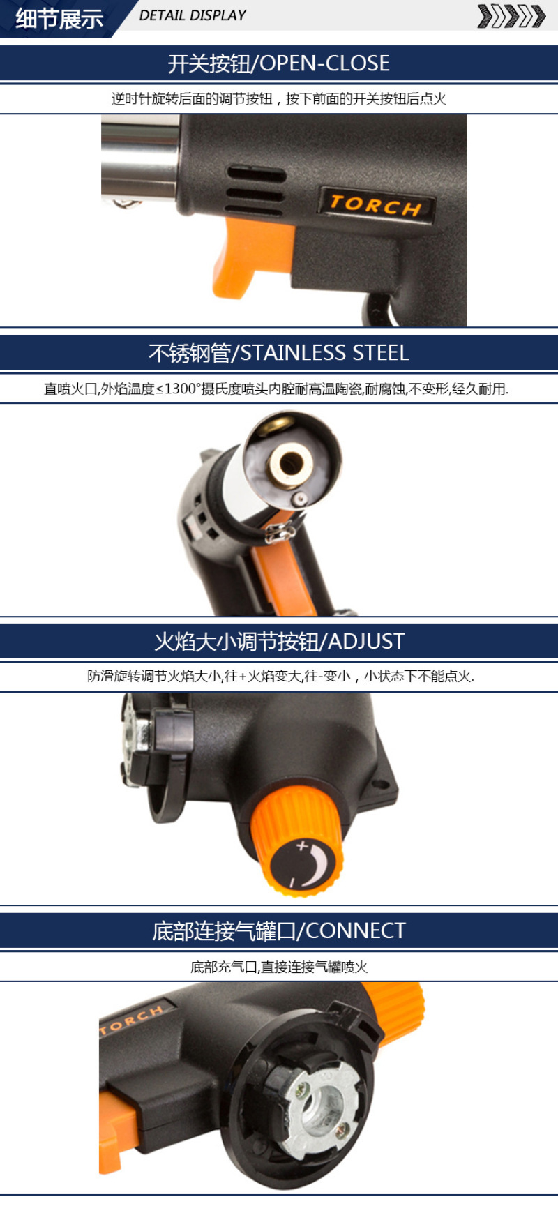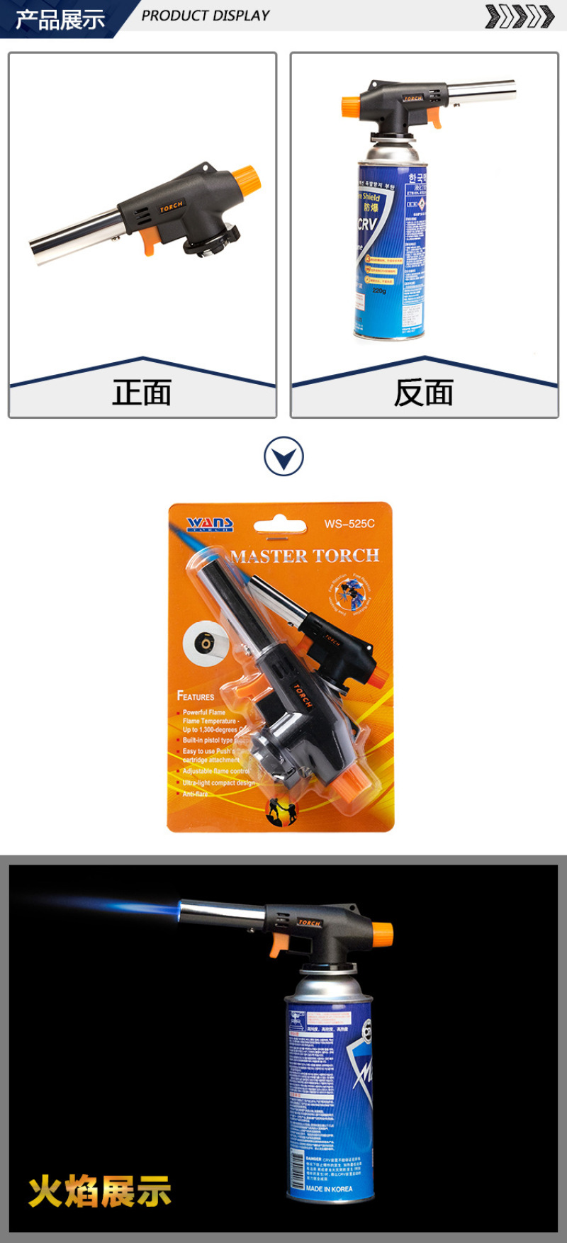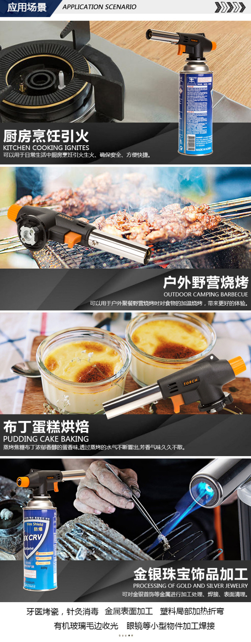 About Product:Cake surface fire/baking treatment ● fromage cake/mousse cake demoulding ● barbecue ● field boiling water/cooking/hot pot, etc. ● field fire extraction ● treatment Trotter, handle pig head, etc. ● Iron pipe/copper pipe/plastic pipe, etc. elbow ● metal surface cleaning ● cement/terrazzo surface treatment is natural stone surface ● welding ● cutting ● bamboo and wood crafts processing and production ● Pipeline thawing ● engine winter quick heating before start ● building waterproof construction ● drying, heating