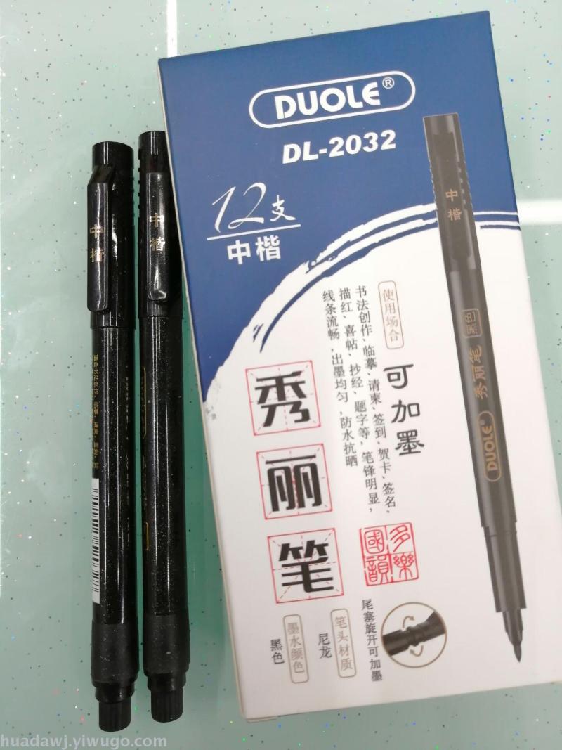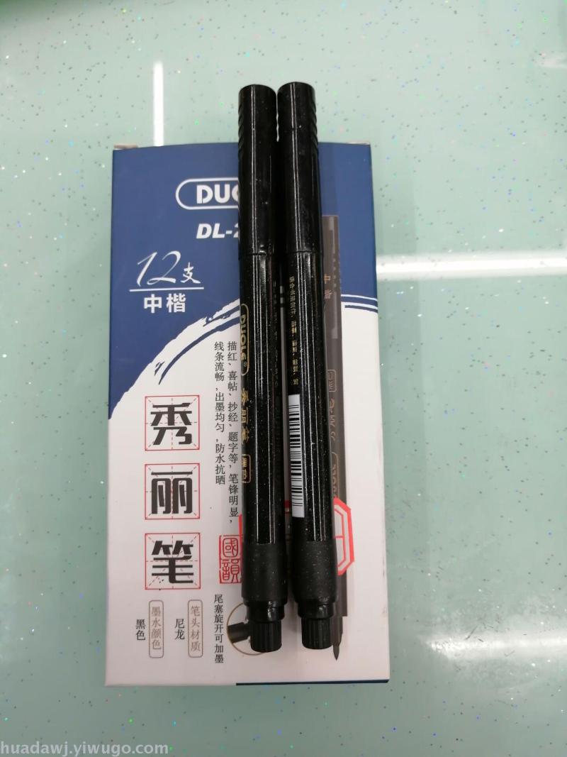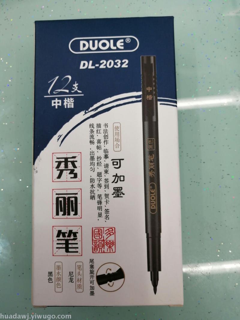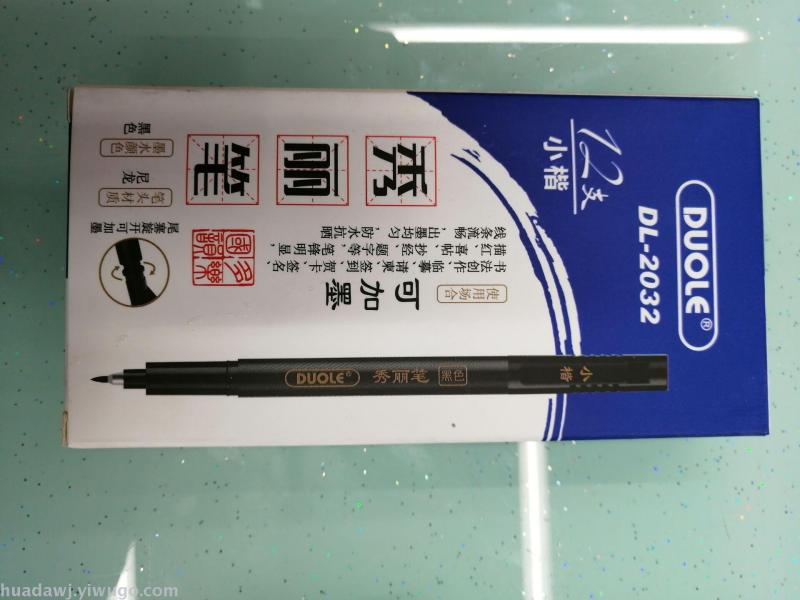About Product:DL2032 medium regular script pen type writing brush soft head material is environmentally friendly, ink writing is smooth, water is even, waterproof and sun-resistant, obvious pen, smooth lines, can calligraphy creation, copy, invitation card, sign in, signature, greeting card, tracing, etc, factory Direct sales, samples can be customized. The shelf life is 2 years at room temperature. There are 3 colors of red, blue and black. The packaging method is packaged together. One Piece * 12 pieces * 120 pieces = 1440 pieces, the volume is 0.08, weight 25KG, welcome to buy! Contact Information: QQ, WeChat, mobile phone or interview.