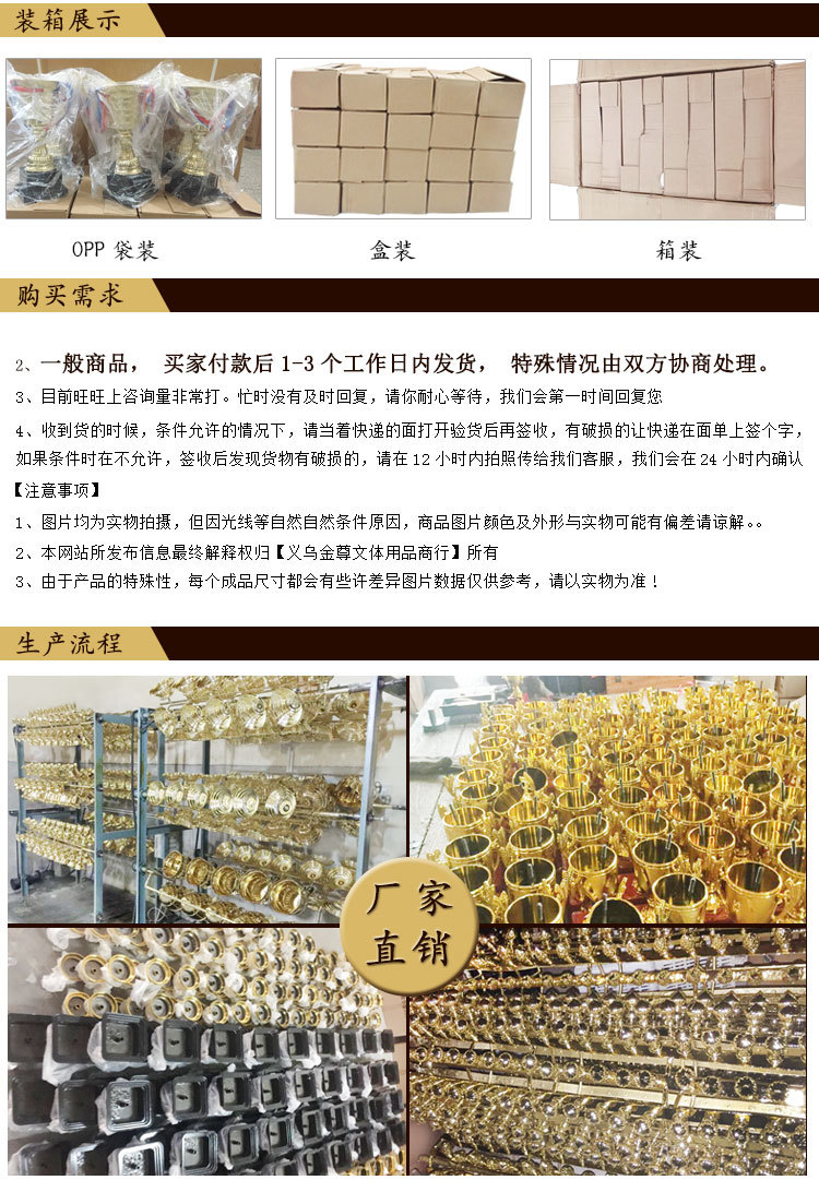 Yiwu jinzun stationery and sports products factory is a company specialized in the production and processing of trophies, MEDALS, MEDALS, badges, certificates, gifts, prizes, souvenirs, accessories, metal materials, advertising materials and other products, with a complete and scientific quality management system. Yiwu jinzun stationery and sports products factory integrity, strength and product quality recognized by the industry. Welcome friends from all walks of life to visit, guidance and business negotiations.