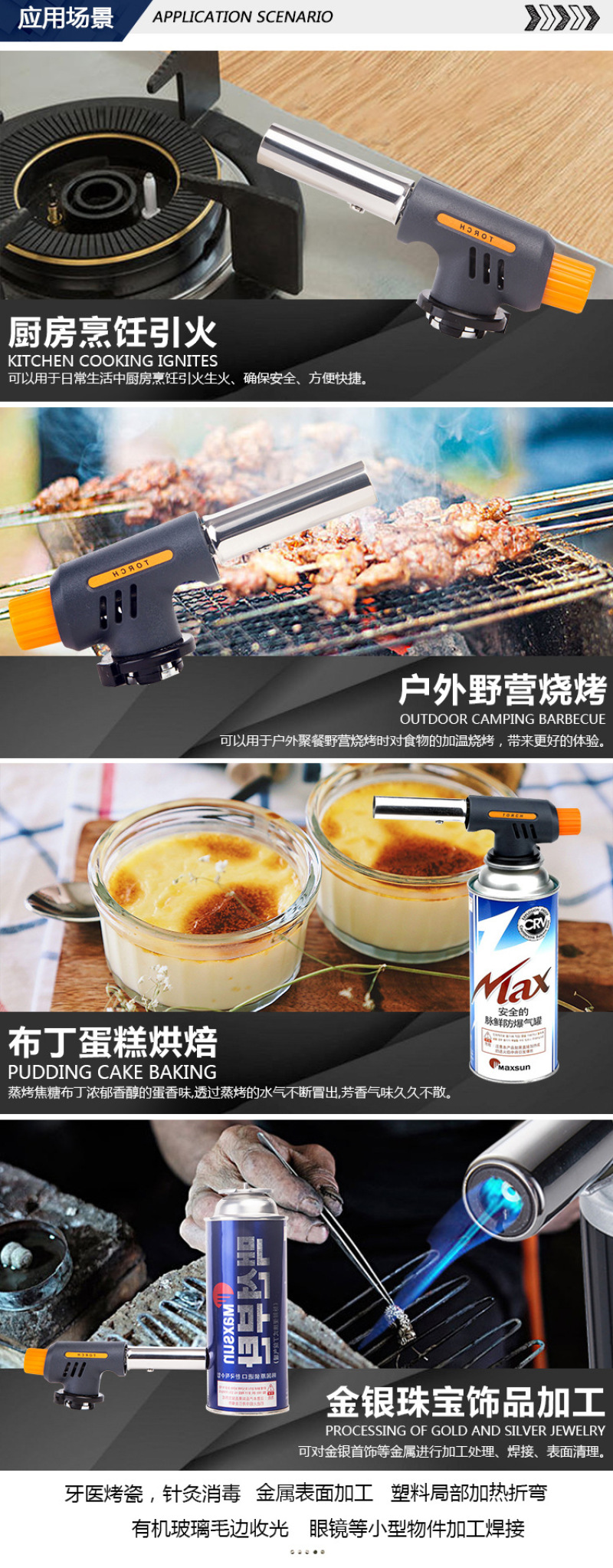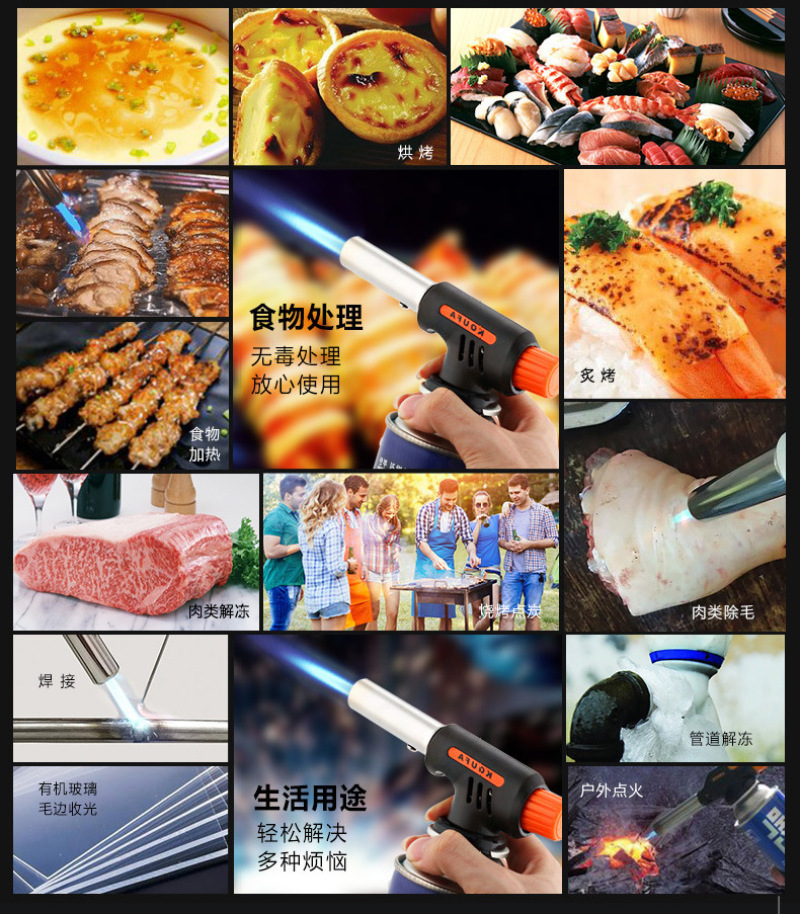 About Product:Welding torch spray gun manufacturers selling portable outdoor camping barbecue lighter spray gun, low flame/baking cake surface processing low cheese cake/mousse cake mold release low barbecue low water/cook/wild hotpot \"wild fire dealing with pig's feet, such as processing pig and so on low iron/copper/plastic pipe bend low metal surface cleaning low cement/terrazzo surface treatment for the natural stone material surface low welding low cutting processing, low bamboo handicraft production low pipe freezing winter before the start of low engine fast heating low building waterproof construction low drying, heating