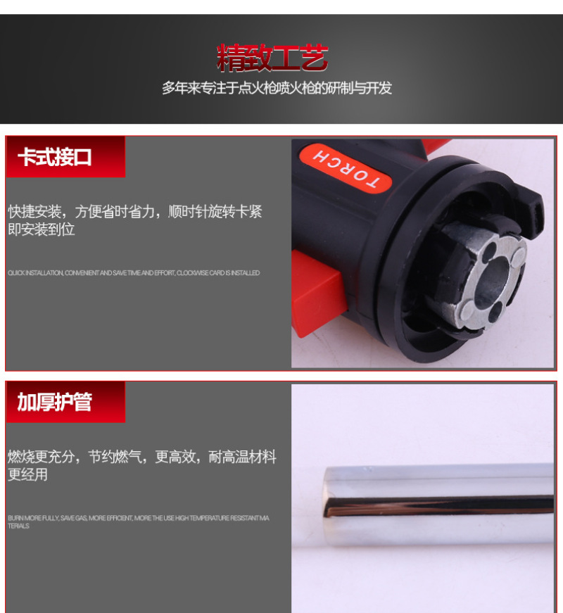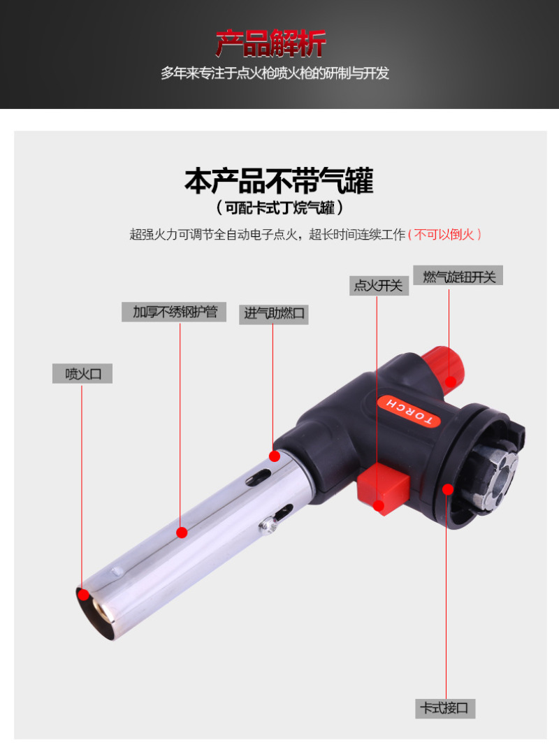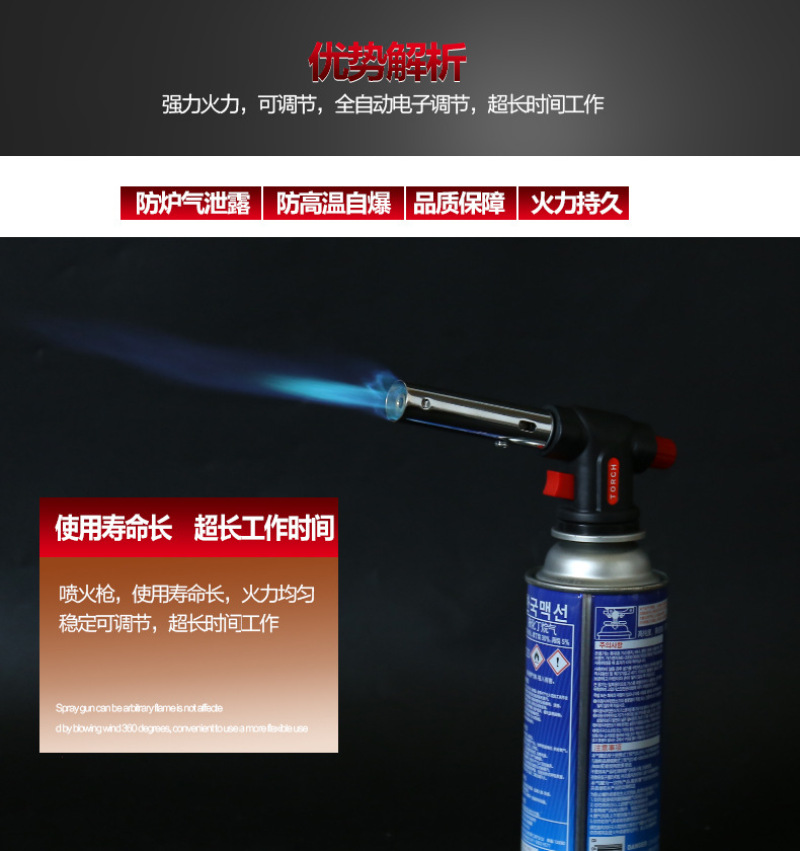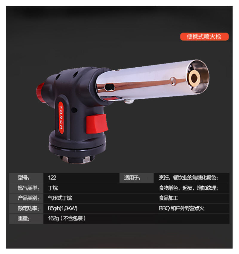 About Product:Welding torch spray gun manufacturers selling portable outdoor camping barbecue lighter spray gun, low flame/baking cake surface processing low cheese cake/mousse cake mold release low barbecue low water/cook/wild hotpot \"wild fire dealing with pig's feet, such as processing pig and so on low iron/copper/plastic pipe bend low metal surface cleaning low cement/terrazzo surface treatment for the natural stone material surface low welding low cutting processing, low bamboo handicraft production low pipe freezing winter before the start of low engine fast heating low building waterproof construction low drying, heating