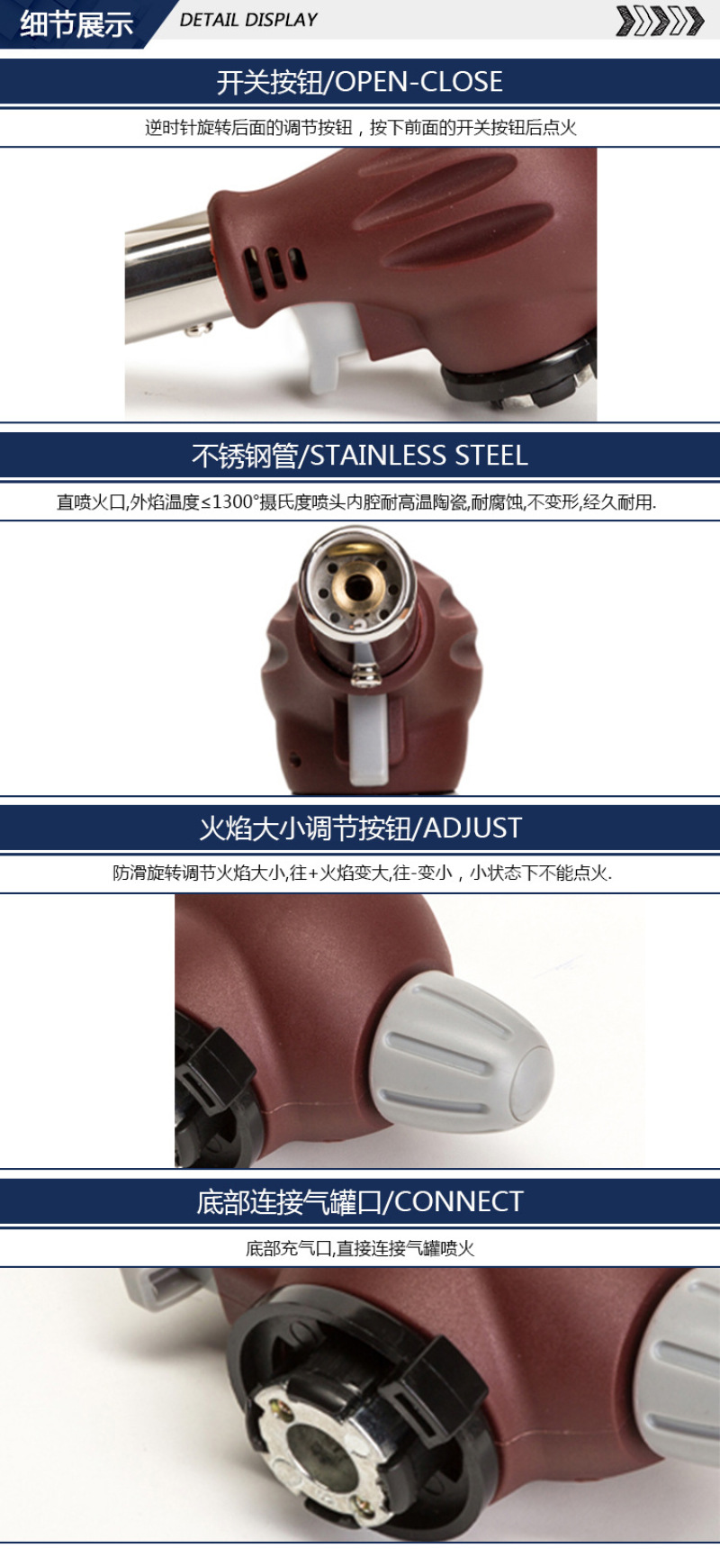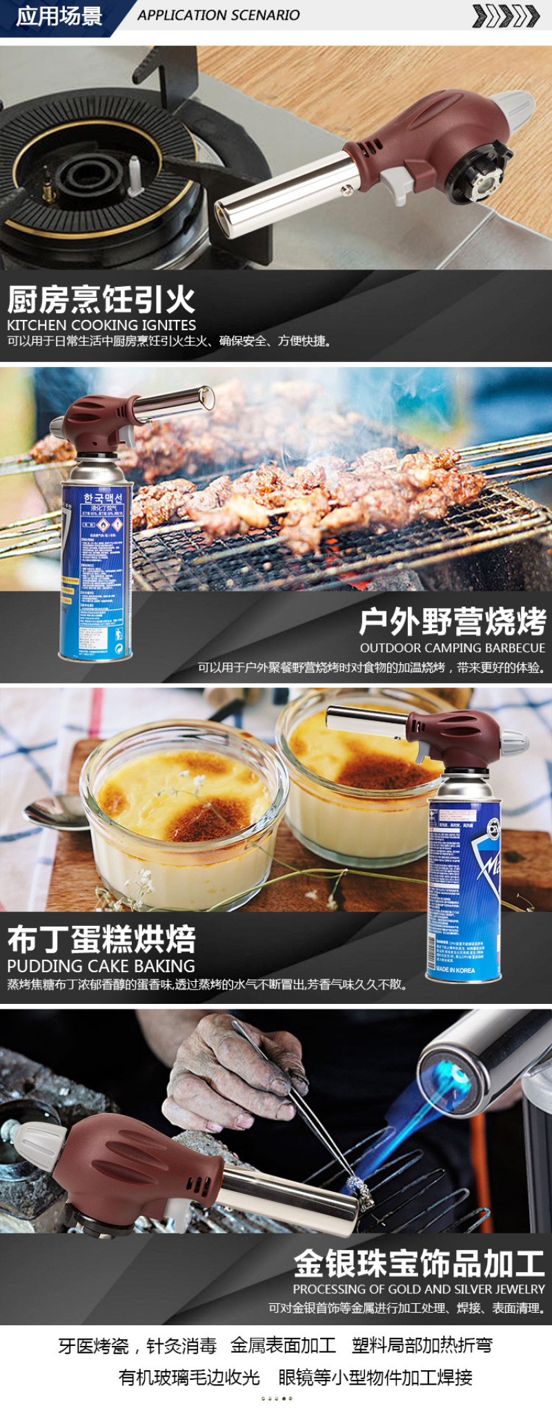About Product:Factory Direct sales welding gun flame gun portable outdoor camping barbecue igniter flame gun, ● cake surface fire/baking treatment ● fromage cake/mousse cake demoulding ● barbecue ● field boiling water/cooking/hot pot, etc. ● field fire extraction ● treatment Trotter, handle pig head, etc. ● Iron pipe/copper pipe/plastic pipe, etc. elbow ● metal surface cleaning ● cement/terrazzo surface treatment is natural stone surface ● welding ● cutting ● bamboo and wood crafts processing and production ● Pipeline thawing ● engine winter quick heating before start ● building waterproof construction ● drying, heating