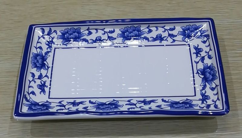 About Product:This is a style 8-inch A5 melamine blue and white flower rectangular plate. A5 melamine is 100% melamine, which is the best melamine material and can be sterilized at high temperature. For more information, please call