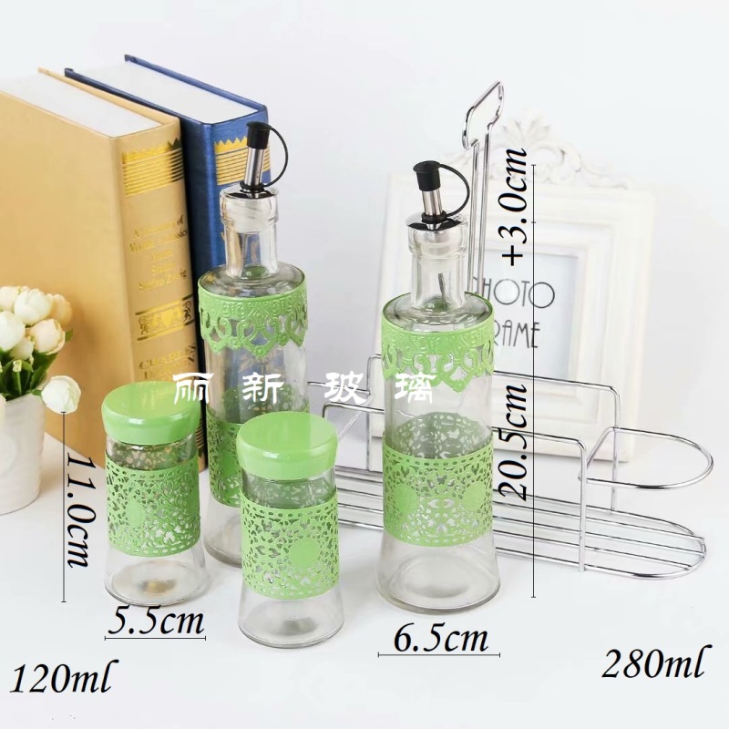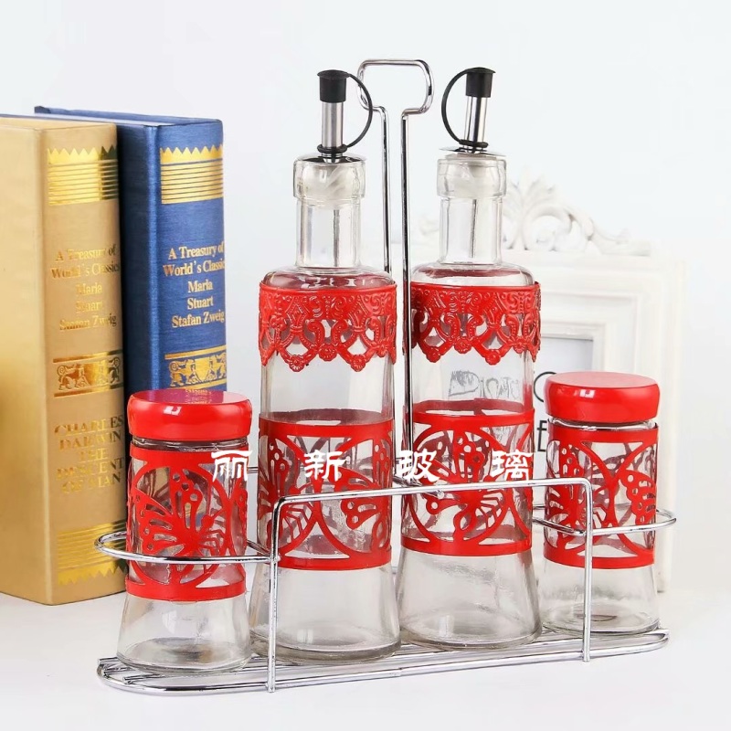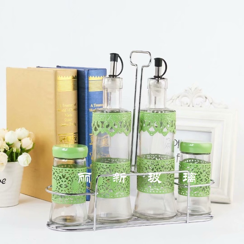 iron frame 4-piece glass seasoning jar seasoning bottle oil bottle pepper cellar bottle cover pack