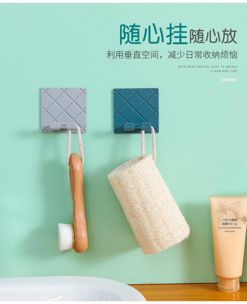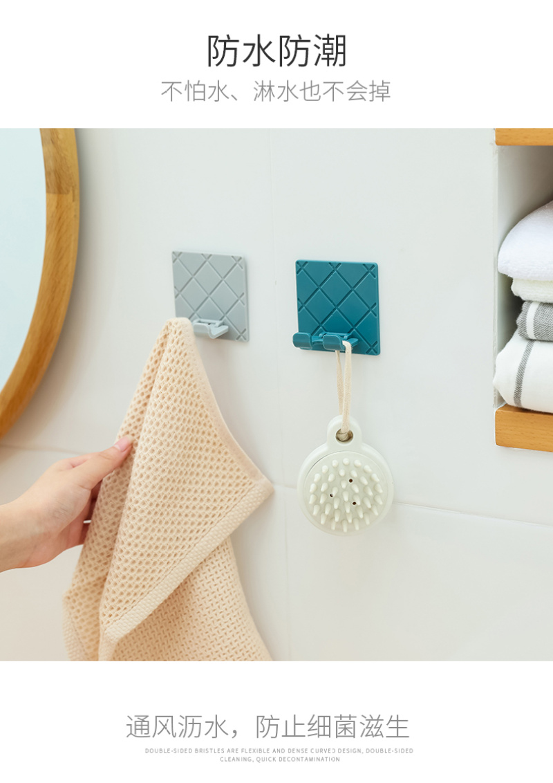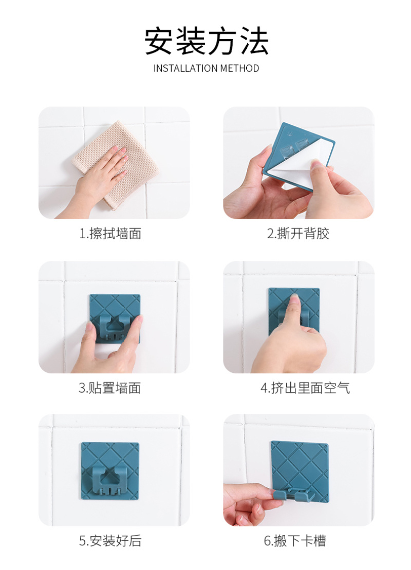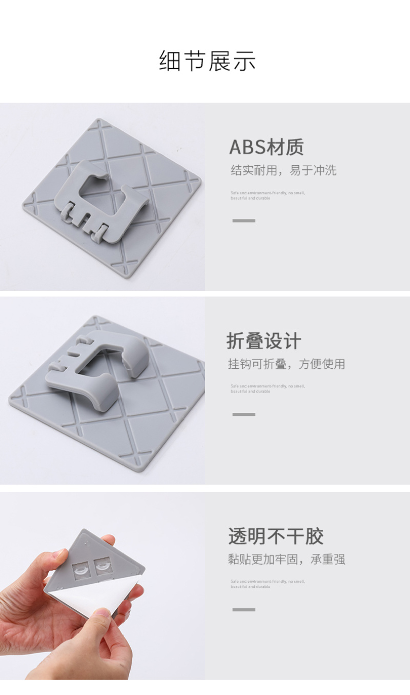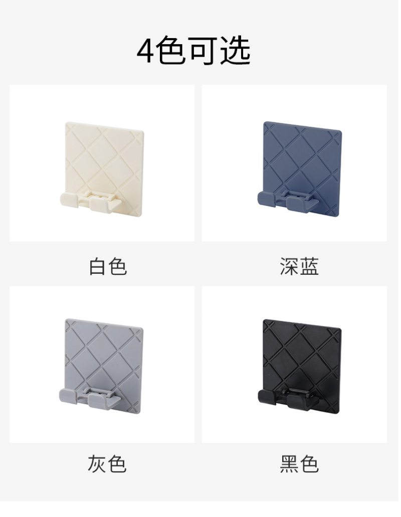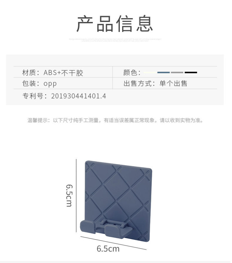 【产品颜色】:灰色、白色、深蓝色、黑色 【产品尺寸】:6.5*6.5cm 【产品材质】:ABS+无痕胶 【包装方式】:OPP袋 【装箱数量】:800PCS