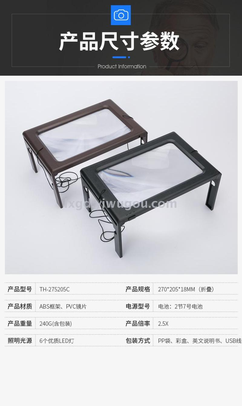 About Product:TH-275205C new USB desktop with light magnifying glass reading magnifying glass ABS magnifying mirror, material: ABS, conventional color box packaging, 60 PCs per piece