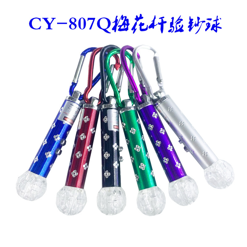 此产品称为镭射激光灯梅花杆验钞球,3个灯孔,2个按钮,1是红外线激光灯,2是紫灯可以验钞票,3按下红灯,再按下红灯紫灯双闪,另配带登山扣,是外出旅游的选择。