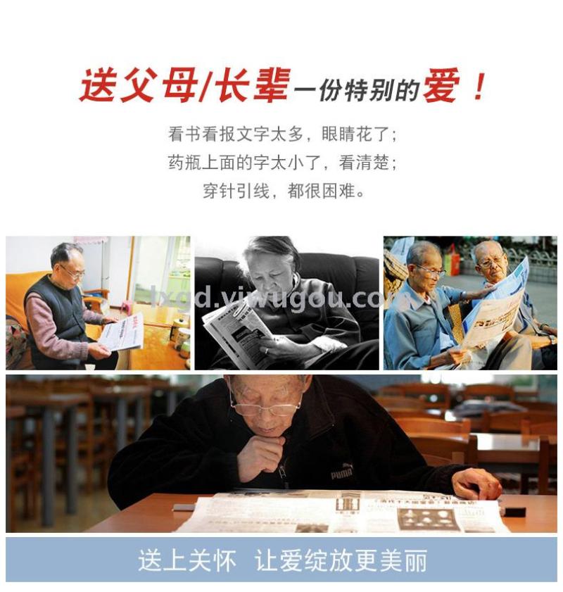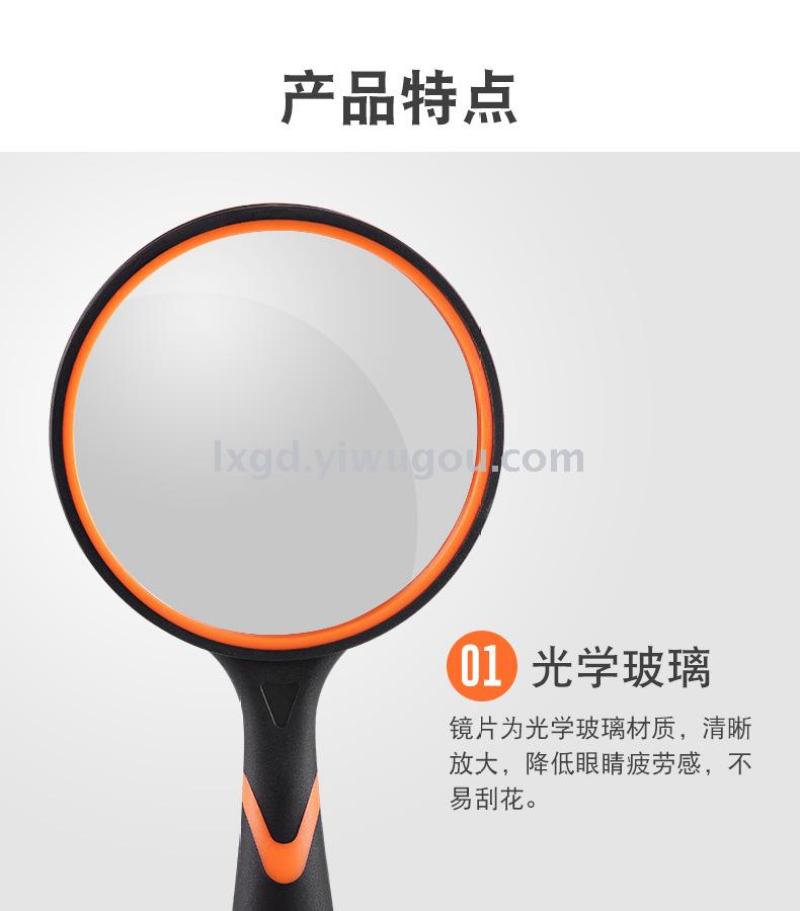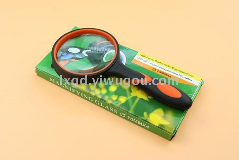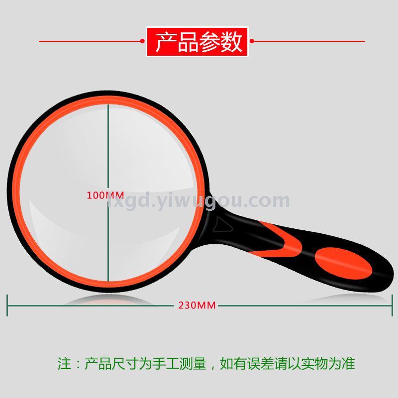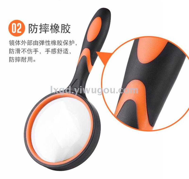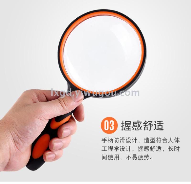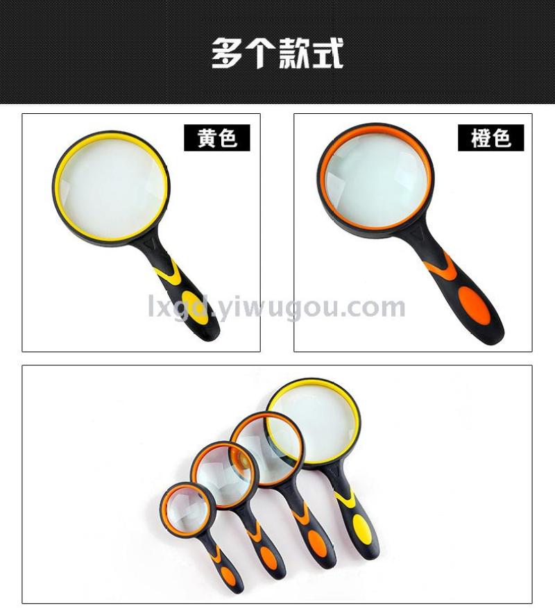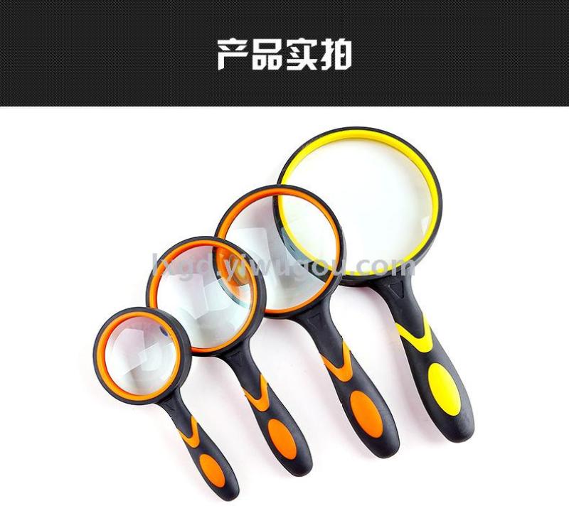 About Product:Portable HD high power low-power hand-held rubber handle elderly reading maintenance magnifying glass 4 sizes available, diameter: 50/65/75mm/100mm, material: inner PP + outer TPR coating are environmentally friendly materials optical glass, conventional color box packaging, color: black and white black blue black yellow orange multi-color optional