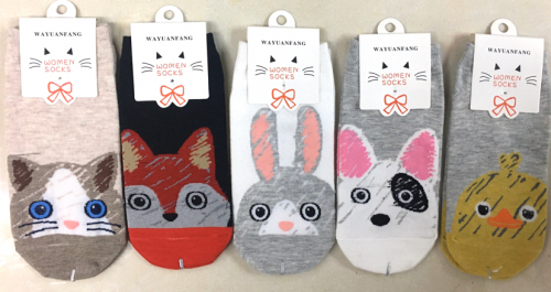女士卡通船袜,材质,棉。尺码,22-26cm。电脑提花立体卡通图案,图案逼真,棉材质吸汗防臭。10一包装,每包装5个颜色,量大优惠。