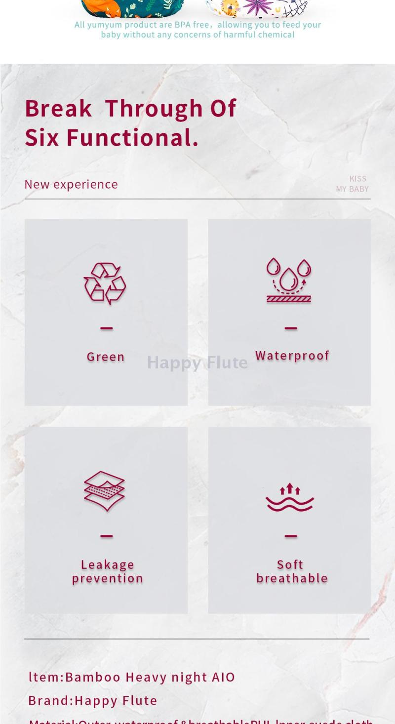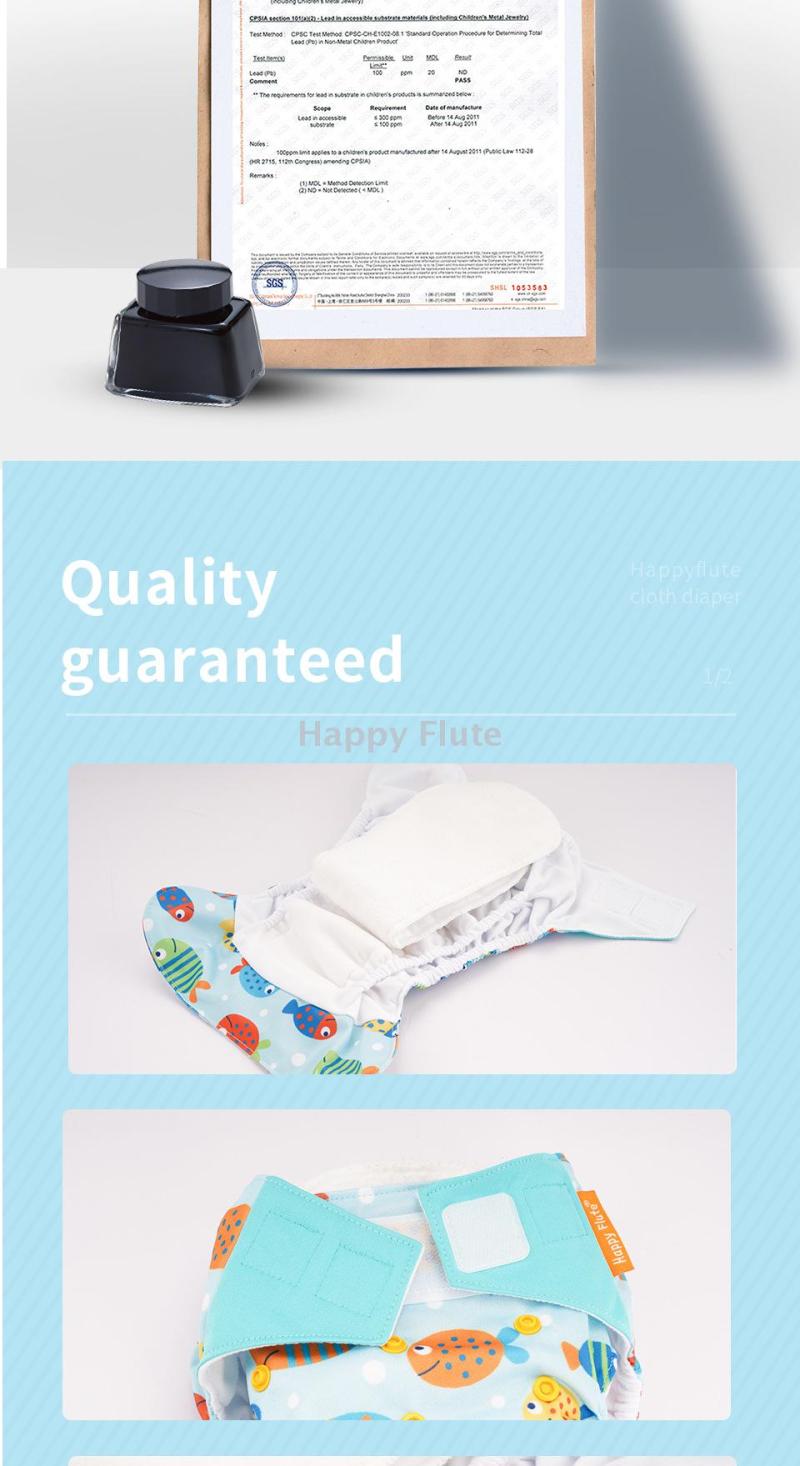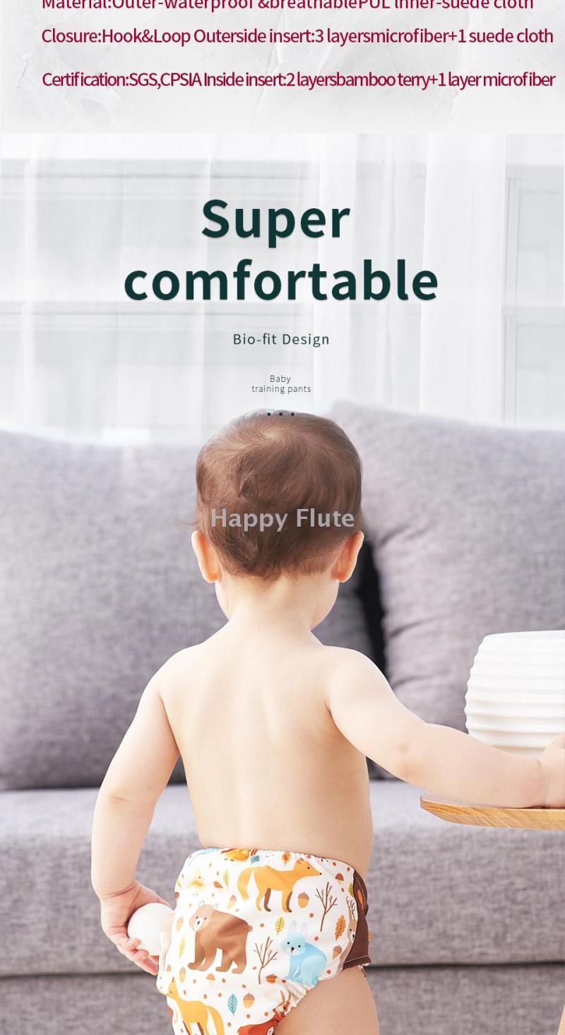 Basic Construction and Usage Instructions 1. This product is designed with a three-layer construction. The inner surface of the outer layer (face fabric) is coated with a composite elastic waterproof TPU film, which offers high elasticity and resistance to tension, good softness, and can withstand multiple washes without deformation or damage. It has a waterproof and breathable function film that prevents the leakage of baby's urine. 2. The inner layer (interior fabric) is made of bamboo charcoal, which has good water absorption and is durable. When the baby urinates, the urine will quickly pass through the interior fabric and be absorbed by the (middle layer) diaper pad, leaving the contact fabric for the baby's skin with only a slight damp feeling. (Different from the general single-layer diaper plus diaper pad, without the inner layer design of the diaper, when the baby urinates, the skin still directly contacts the absorbent diaper pad). 3. The interior fabric of the diaper has a rear waist opening, allowing the absorbent diaper pad to be placed inside. When the baby moves, the diaper pad will not come out. It is easy to take out the absorbent diaper pad and wash it separately from the diaper, significantly shortening the drying time.