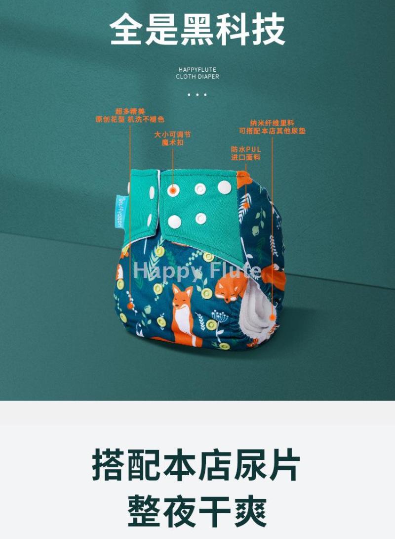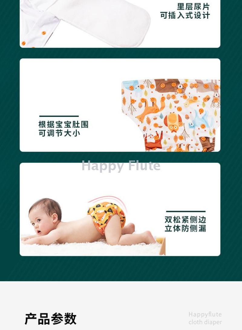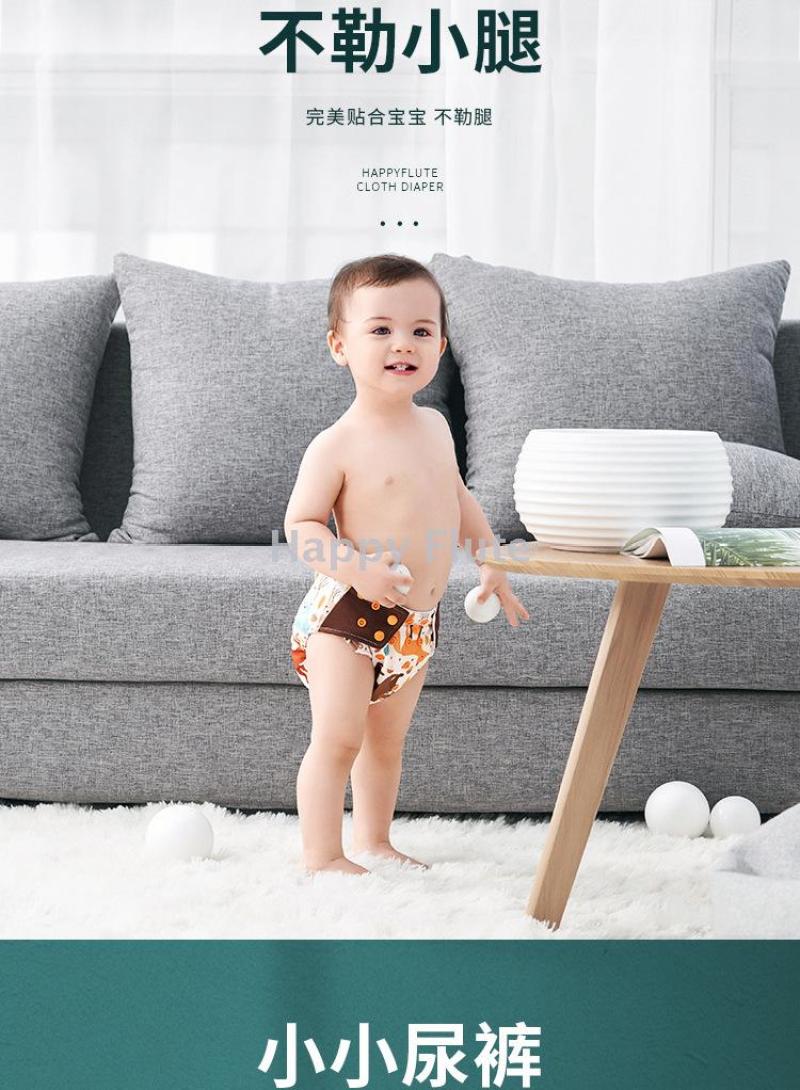 Happyflute baby cloth diapers with water resistance and side leak protection, washable, baby cloth pants, and urinal pocket.