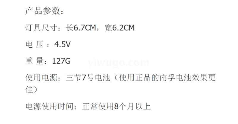 About Product:Product Parameters: Lamp Size: length 6.7CM, 6.2CM wide voltage: 4.5V weight: 127g power supply: Three 7th batteries (better use of genuine Nanfu batteries) power supply Use Time: normal use for more than 8 months