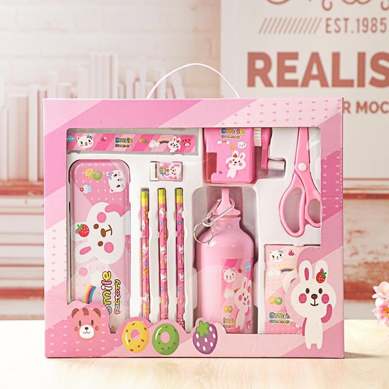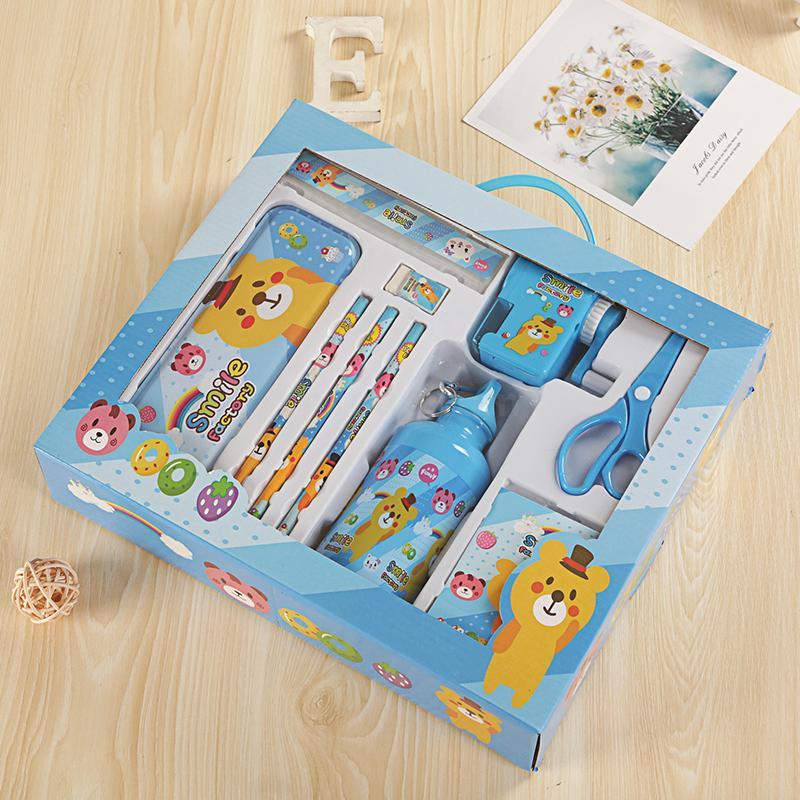 Composition: One elegant kettle, three pencils, one pencil case, one eraser, one hand-cranked pencil sharpener, one soft card notebook, one ruler, and one pair of scissors.