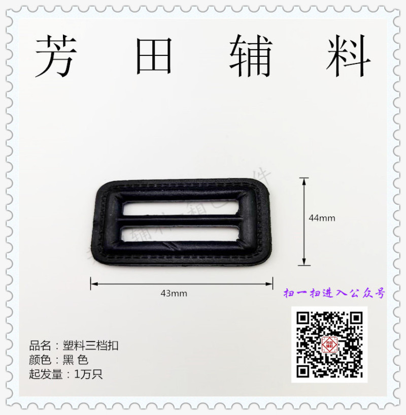 【产品型号】:塑料三档扣 【产品尺寸】:内径43mm 【产品材质】:塑料 【产品颜色】:黑色有现货其他颜色可定制 |