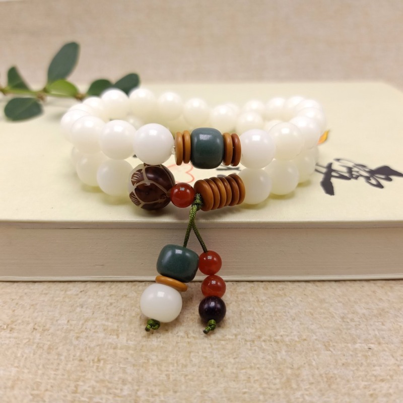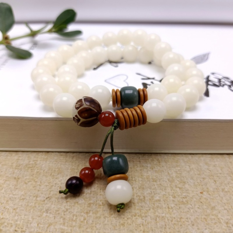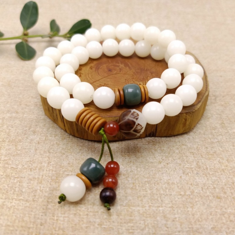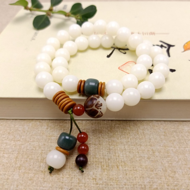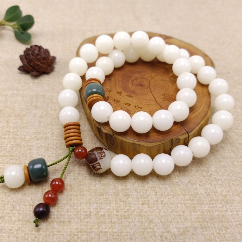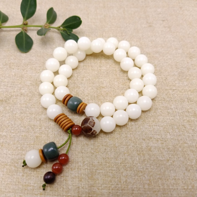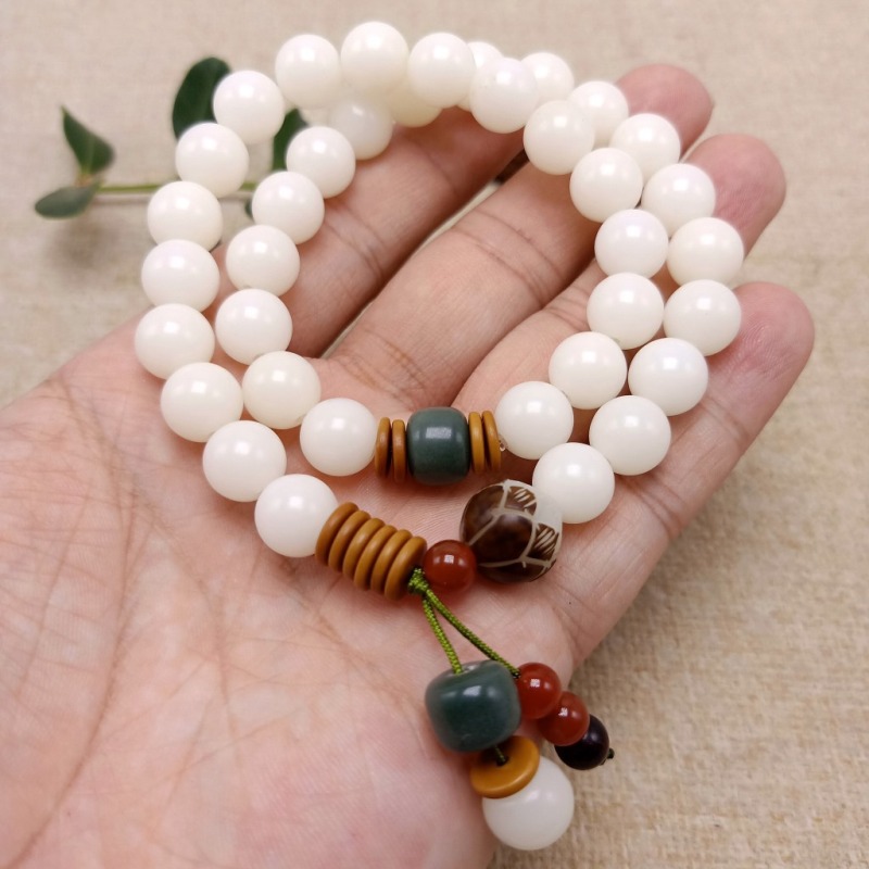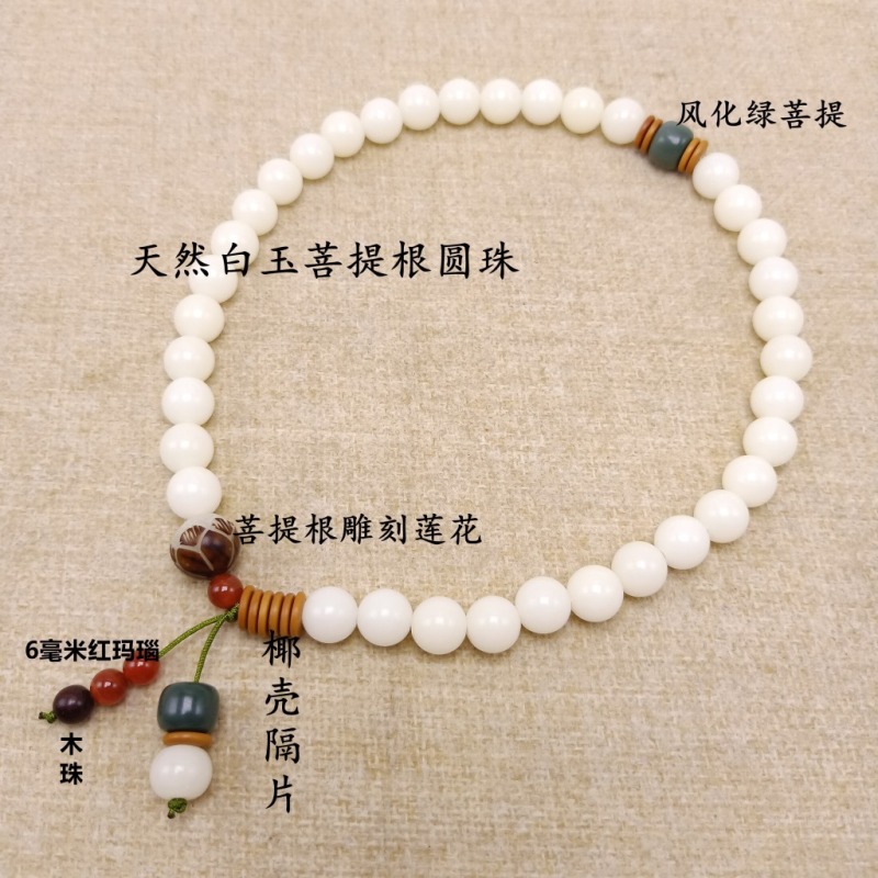 【主材】:36颗天然约10毫米白玉菩提根圆珠,本手串可手持当念珠,也可当手链戴2圈.