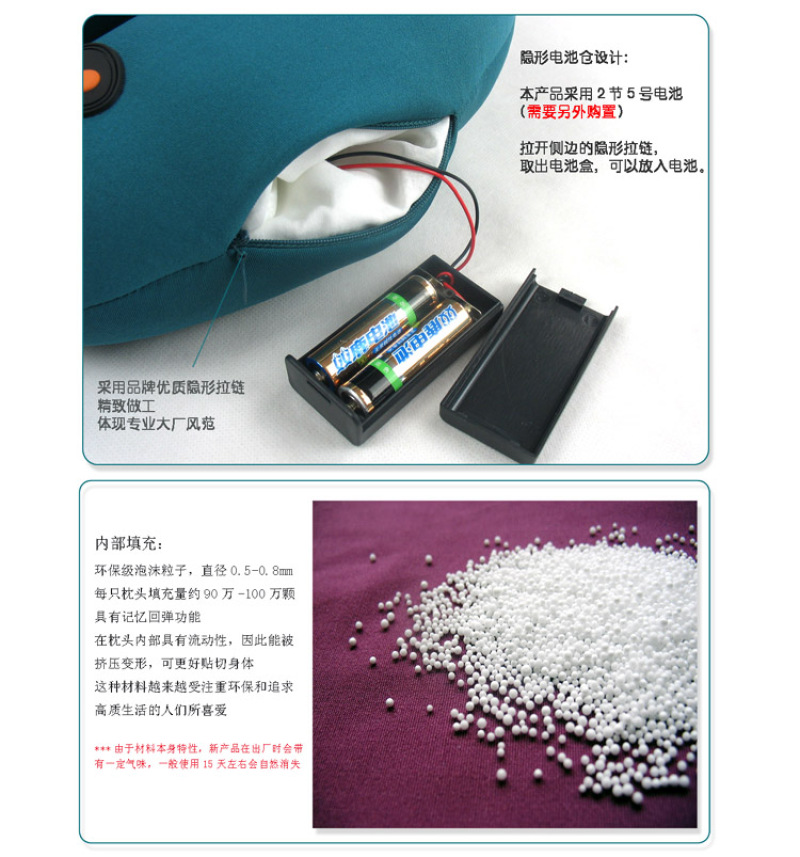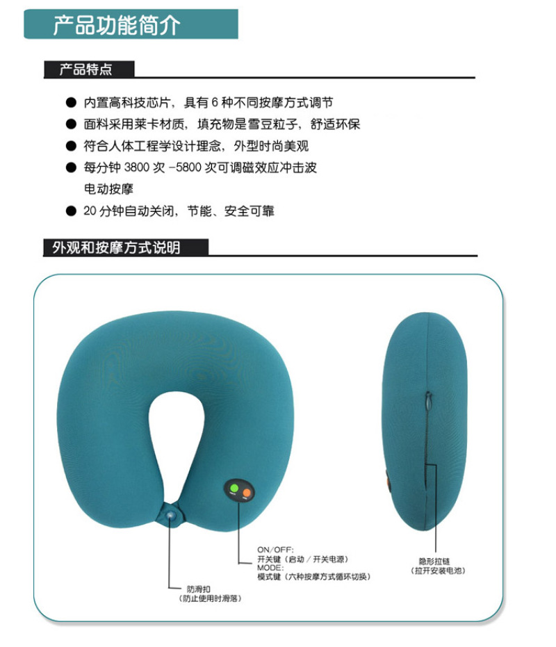 About Product:Grade U type cervical vertebra massage pillow, Lycra stretch cloth material, filled with food grade Environmental protection snow bean particles, built-in 6 grade adjustable massager, Suitable for home, travel, car, lunch break