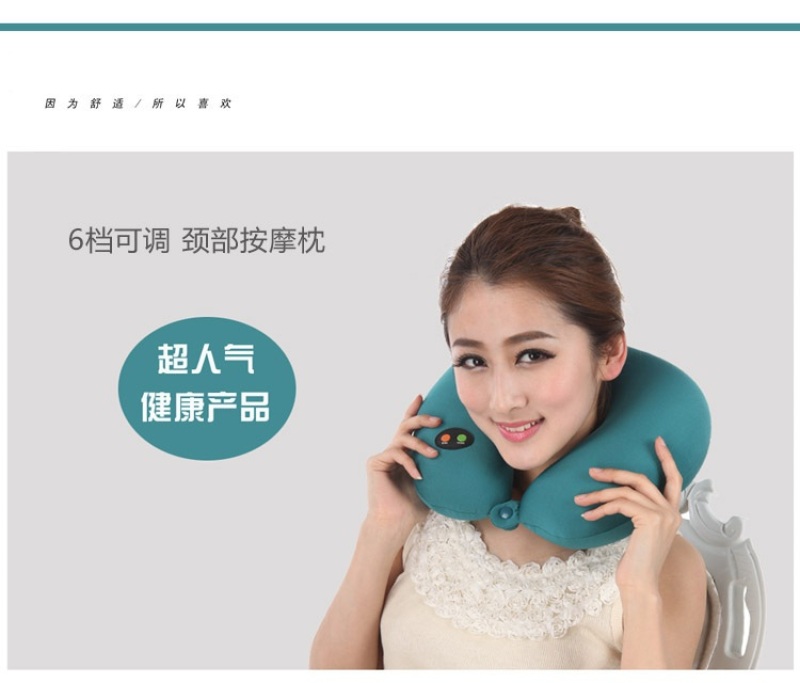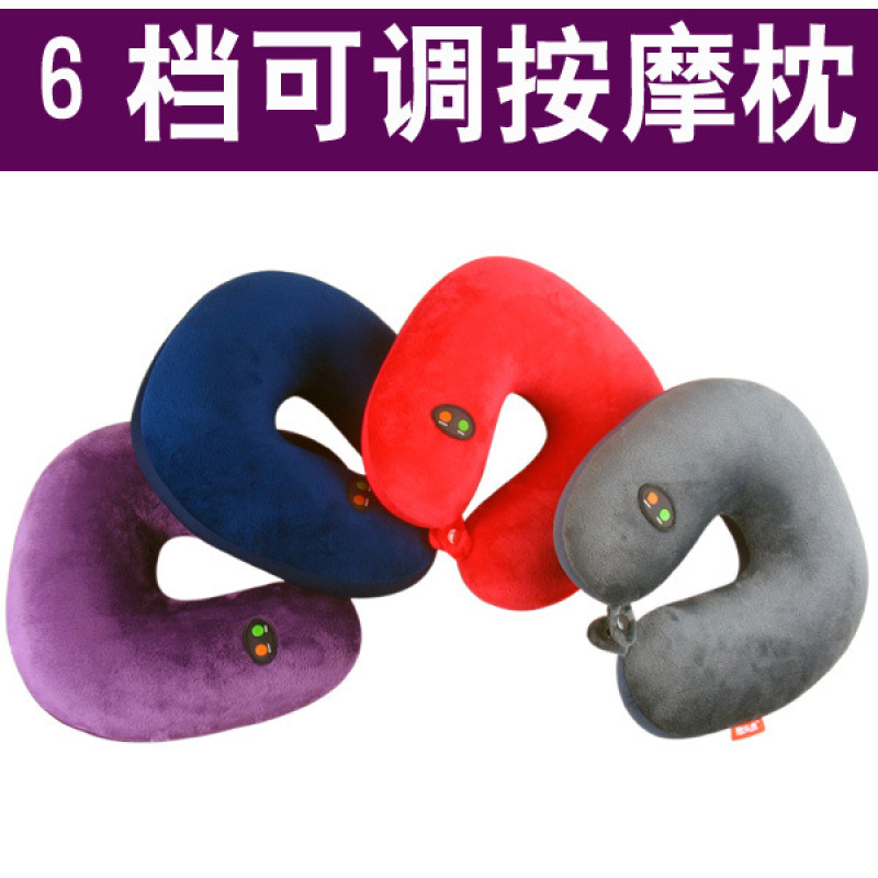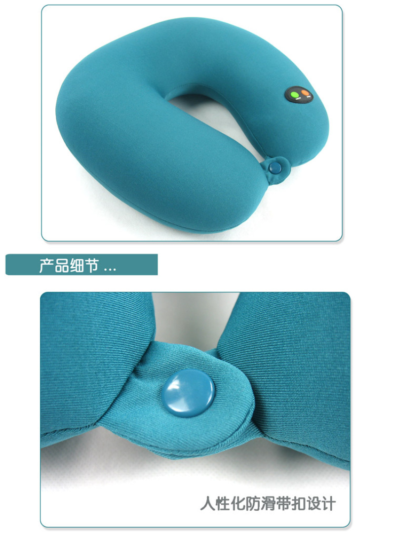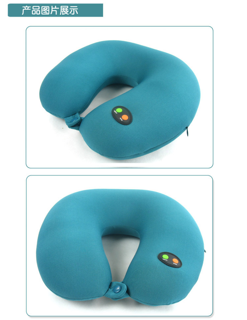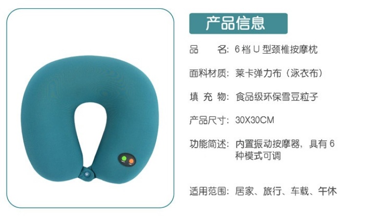 6 grade U type cervical vertebra massage pillow, Lycra stretch cloth material, filled with food grade environmental protection snow bean particles, built-in 6 grade adjustable vibration massager, suitable for home, travel, car, lunch break