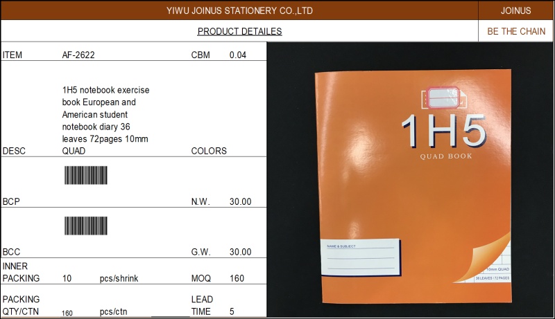 1H5 notebook exercise book European and American student notebook diary 36 leaves 72pages 10mm QUAD AF-2622