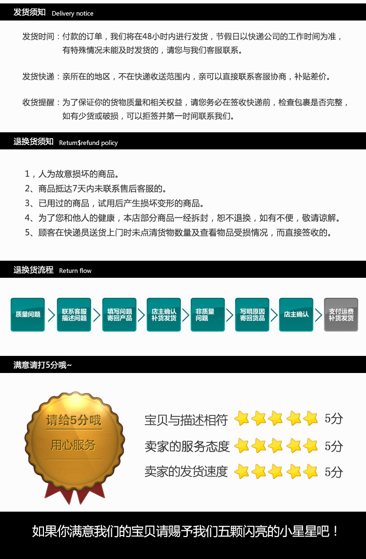 Contact Customer Service Please contact us via Alipay, make sure to contact the same customer service for more professional service! Due to the large volume of inquiries, Alipay is usually overloaded. If you haven't received a response for a long time, you can choose to self-service shopping according to the description. Please directly write the color, size, and shipping information in the remarks. If you have any special needs, please leave a message, and we will process them one by one. Signing Please sign for the parcel, open it in front of the courier, and check if the goods are damaged. Check if the quantity is correct. If you find any problems, please refuse to sign. Once signed, it is considered that the goods are recognized. Size Issues The size is measured by hand, and there may be a 2mm error due to factors such as different measuring tools and methods. Color Difference Issues All the goods photos in our store are taken by ourselves, and we try to keep them consistent with the actual goods. However, due to the limitations of photography technology, there may be some color differences.Due to environmental lighting and monitor color differences, there may be a slight color difference between the picture and the actual item. Please refer to the actual color of the item for the final assessment. We take great care in running our store and value your feedback. We always strive to provide the best service and to establish long-term friendly relationships with our customers. If you have any dissatisfaction with the goods after receiving them, please do not give a neutral or negative rating without saying anything. Because a neutral or negative rating is not a solution for both of us. It also cannot make you from dissatisfaction to satisfaction! Thank you for your strong support!
