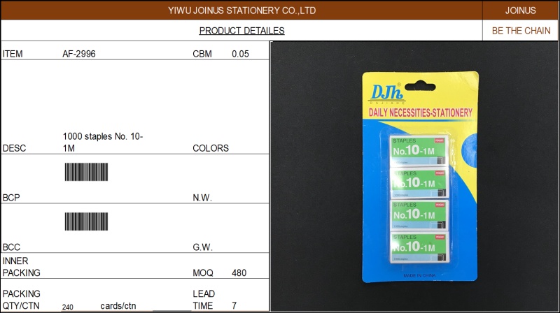 About Product:订书针卡装1000 staples No. 10-1M AF-2996