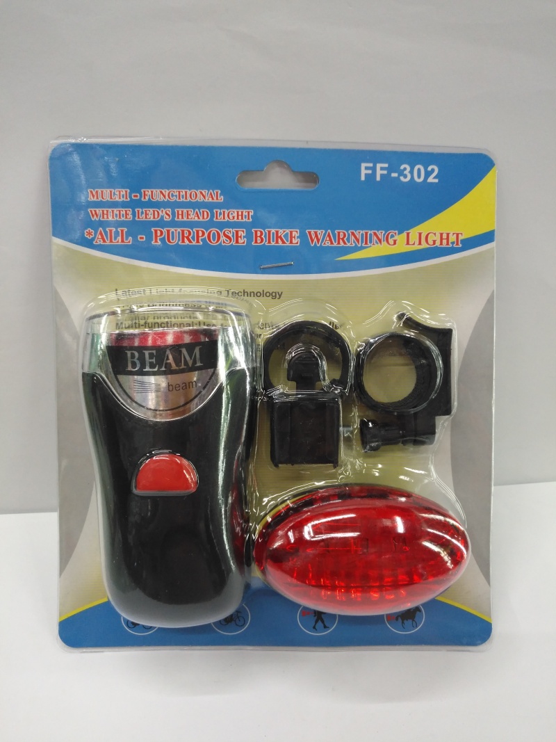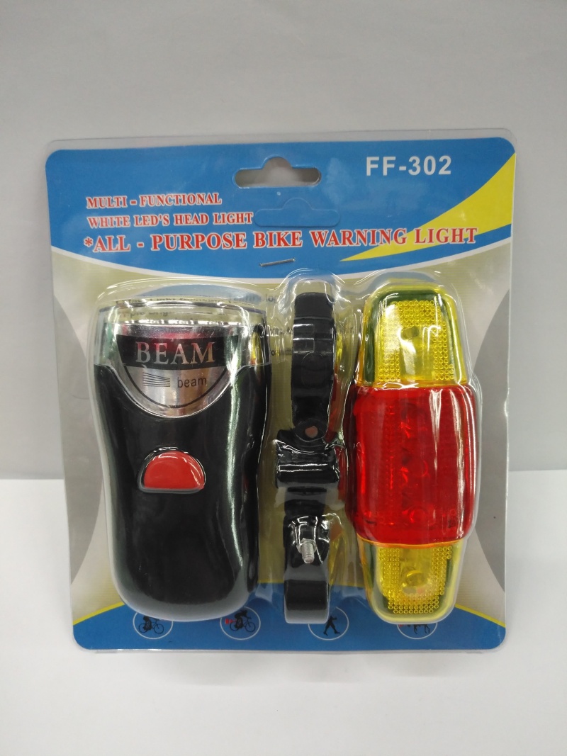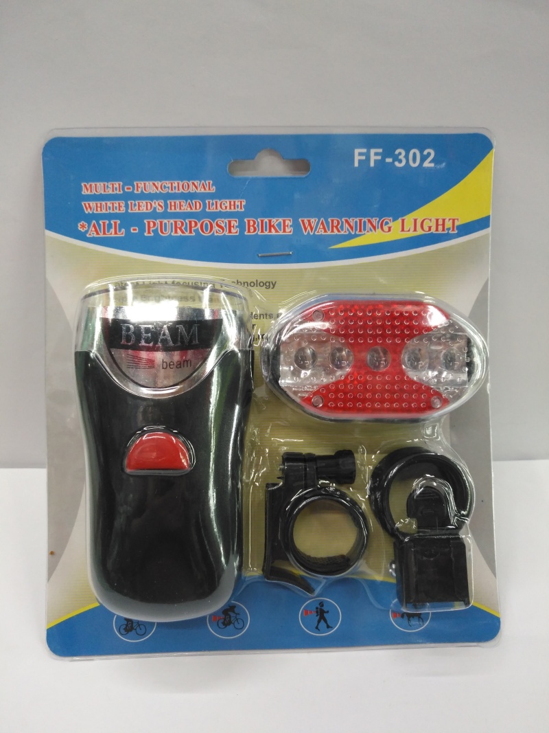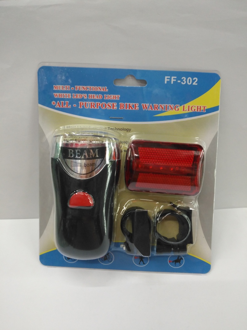 About Product:Hot selling bicycle lamp set, headlight and tail light plastic shell, headlight 5LED energy-saving lamp bead white light tail light 5LED red light, using 3 AAA batteries, card pack per box 120 sets