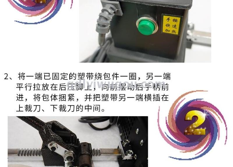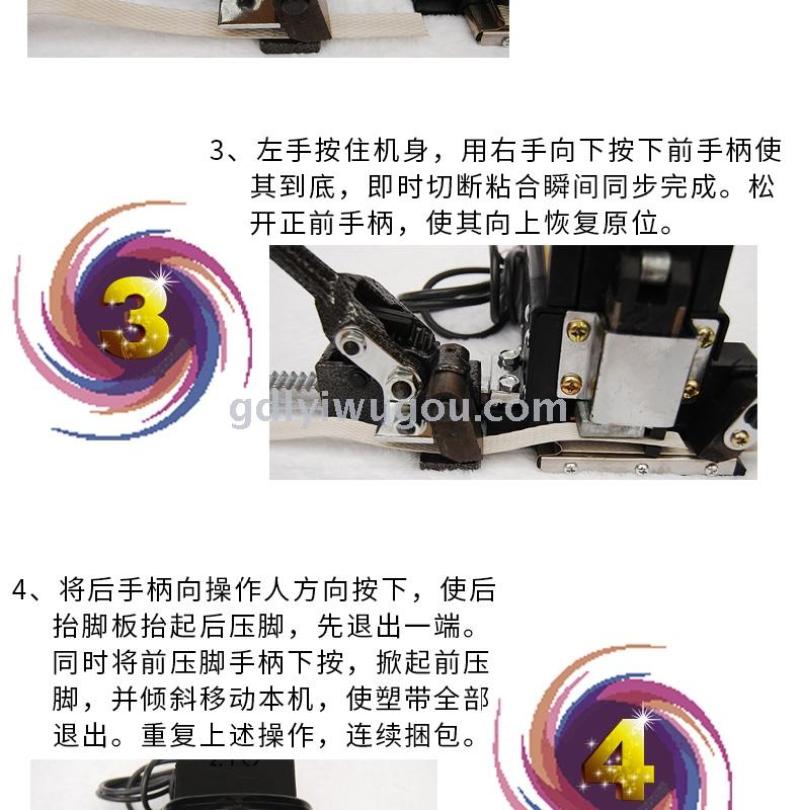 About Product:Power supply 220V50HZ power 200W packing tape width 6-15mm minimum packing material 200 * 200mm maximum packing material is not limited, packing speed depends on proficiency maximum binding force 400N (adjustable) overall size 370*250 * 230mm Machine weight; 3.8kg portable electrofusion baler use light baling strong adhesion packaging beautiful use cutting belt heat sealing instant synchronization completed without iron button no need to take clamp buckle packing is an ideal substitute for traditional old-fashioned iron button baler suitable for various industries and various shopping malls factory use special